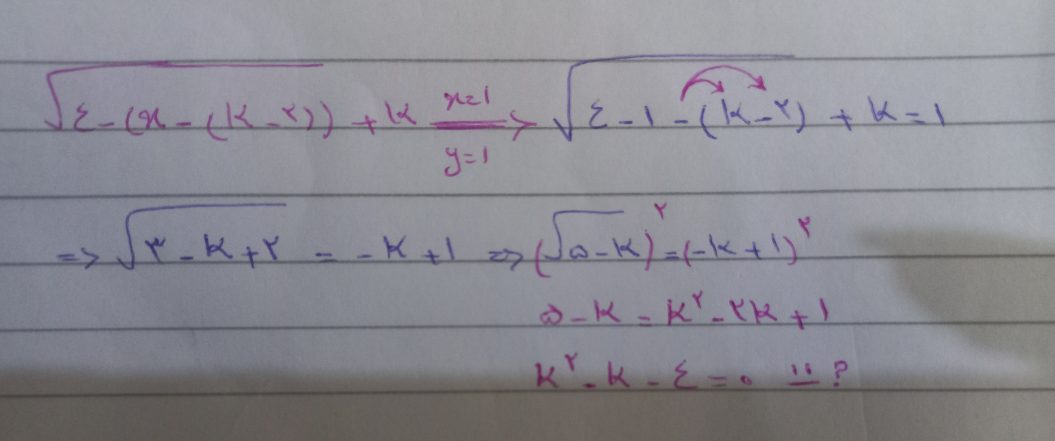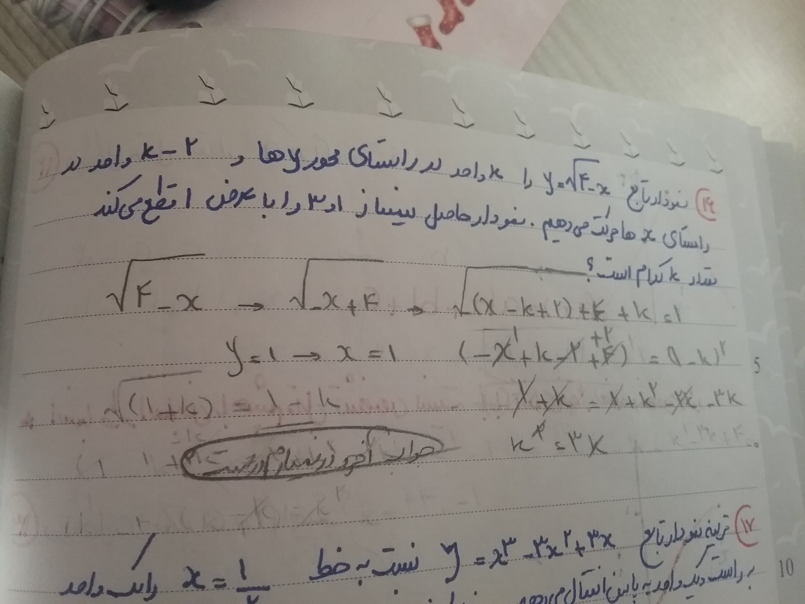 سلام خانم شاهین ساز وقت بخیر توجه کنید که از معادله نهایی شما میشه نتیجه گرفت که x= ۰ یا ۳ ، اما ۳ نمیشه چون یک منهای کا منفی میشه و حاصل یک رادیکال نمیتونه منفی بشه! پس فقط صفر قابل قبوله