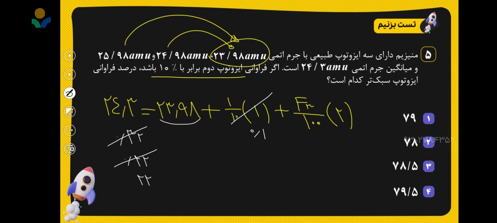 @سید محمد متین رشادی یعنی تعداد کل اتم ها رو در یک نمونه بده و تعداد هر ایزوتوپ رو هم جدا جدا بده و کاری به درصد نداشته باشه بعد چطور با فرمولی که استاد گفت میتونیم درصد میانگین بدست بیاریم؟