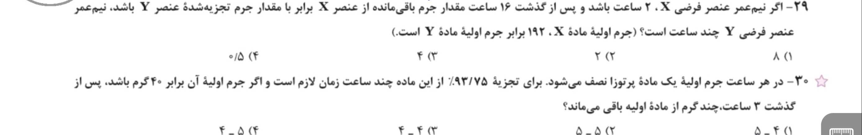 سلام برای حل این سوال شما باید فرمول مقدار باقی مونده رو بدونی و اینکه از روی اطلاعات سوال تشخیص بدی چند تا نیمه عمر گذشته ۳۶.۹ چند برابر ۱۲.۳ هست؟ ۳ برابر پس ۳ تا نیمه عمر گذشته مقدار باقی مونده رو هم داری با استفاده از فرمول مقدار اولیه رو بدست میاری