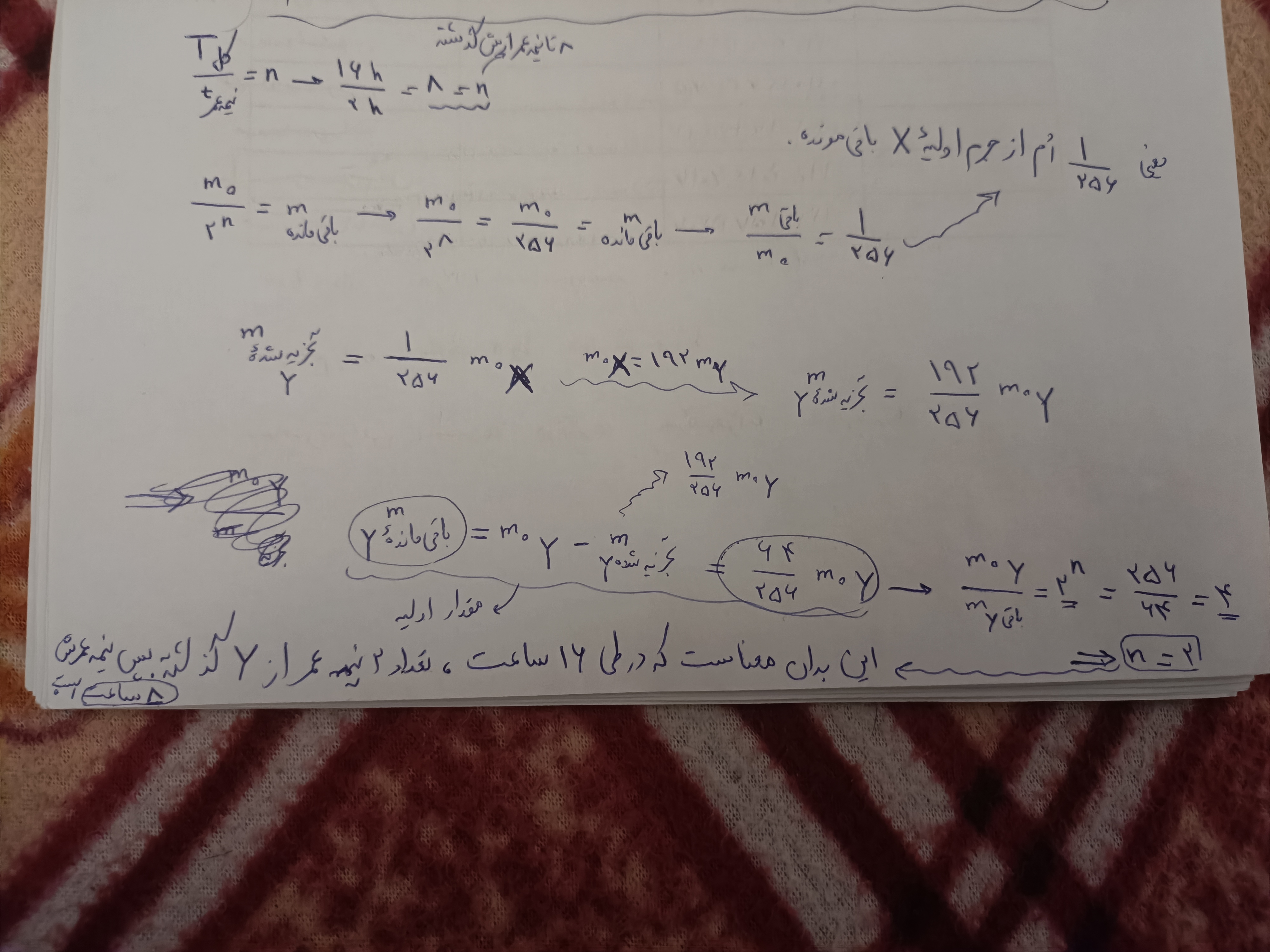سلام. ببین ما سه تا مقدار داریم (مثلا فرض کن یه ماده داریم نیمه عمرش یه ساعته خودشم صد گرمه) مقدار اولیه مصرفی و باقی مانده خب مقدار اولیه که معلومه چیه یعنی اون مقدار ماده ای که اول داریم یعنی مثلا همون صد گرم مقدار مصرفی هم یعنی اینکه چقدر از اون ماده توی واکنش مصرف شده مثلا با گذشت نیم ساعت 25 گرم مصرف شده باقی مانده هم که یعنی چقدر از اون مقدار اولیه باقی مونده الان اینجا مثلا 75 گرم باقی مانده داریم حالا اگه بخوایم مقدار از بین رفته (مصرفی) رو دست بیاریم باید مقدار اولیه رو منهای باقی مانده بکنیم که ببینیم چقدر مصرف شده اگه مقدار اولیه رو m در نظر بگیریم و باقی مانده رو m/2n (دو به توان n) و از هم کمشون کنیم مصرفی بدست میاد.
