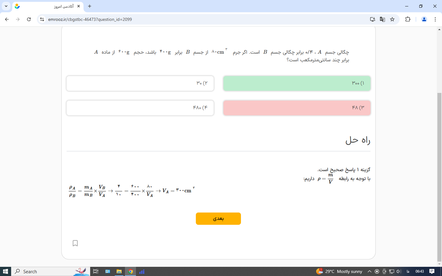 سلام رفقا من یک راه خوب بلدم برا این جور سوال ها ما تو درس نامه خوندیم که اگر جرم ماده ای یکسان باشه در نهایت چگالی با حجم رابطه عکس داره یعنی چی . یعنی اگر حجم بیشتر باشه چگالی کمتر. حجم کمتر باشه چگالی بیشتر ببنید در این سوال به حجم اشکال نگاه کنید صدرصد میبینید که شکل a1 حجم کمتری نسبت به بقیه داره پس چگالی بیشتری داره و بیشتر به اب فرو میره اگر باز دقت کنید میبینید که a3 حجم کمتری نسبت به a2 داره پس a3 که حجم کمتری داره پس چگالی بیشتری نسبت به a2 داره و اخری که شکل a2 میشه از بقیه حجم بیشتری داره از بقیه بزرگ تره چیزی که حجمش بیشتر باشه چگالیش کمتره بنابرین میتونیم بگیم که a1 چگالیش بیشتره چون حجمش کمتره a3 حجم کمتری نسبت a2 داره پس چگالیش بیشتر از a2 هست a2 هم از همه حجمش بیشتره پس چگالی کمتری نسبت به بقیه دارد