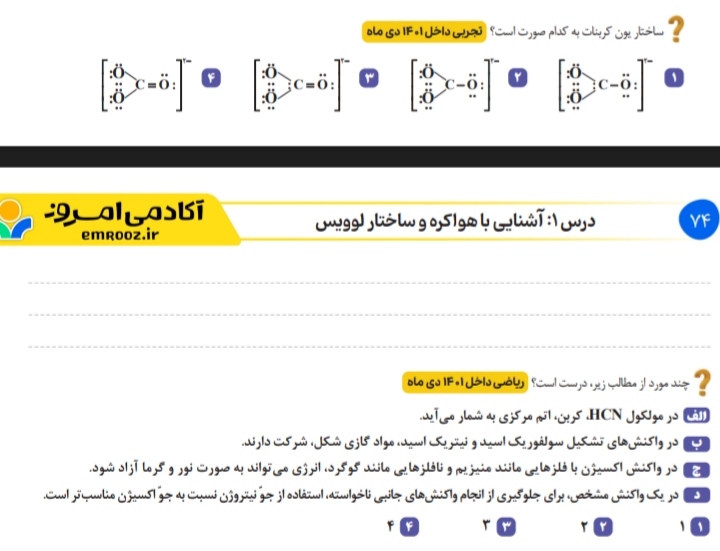 سلام وقت بخیر توی سوالات تمرین تست دوم و میشه برام حلش کنید و توظیح بدید لطفا و اینکه پیوند داتیو هم جزو جفت الکترون ناپیوندی میشه درسته ؟ اگه جزوشون میشه یعنی با پیوند مقابلش برای شمارش الکترون هاش میشه دو جفت که میشه چهارتا اره؟ گیچ شدم