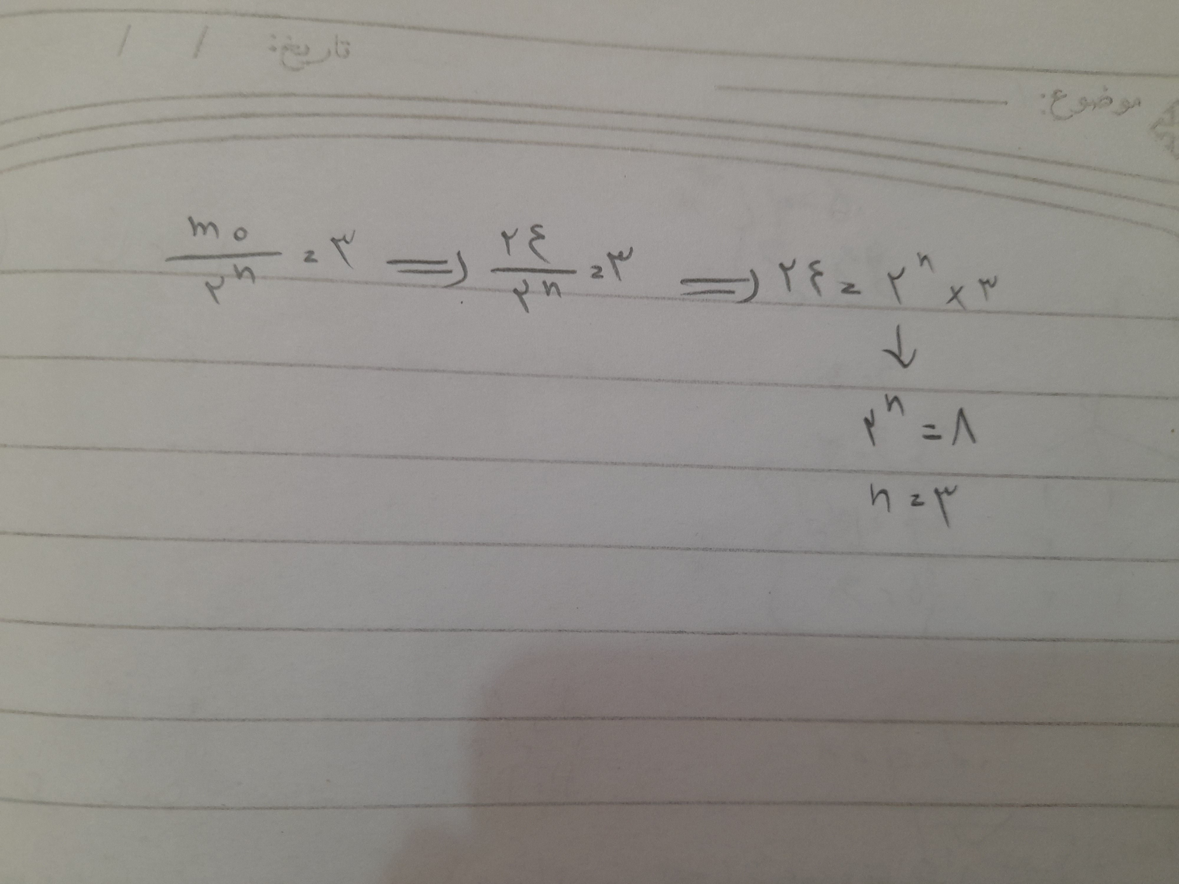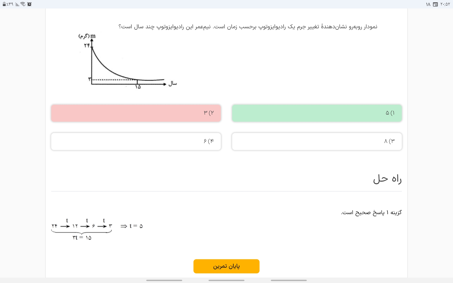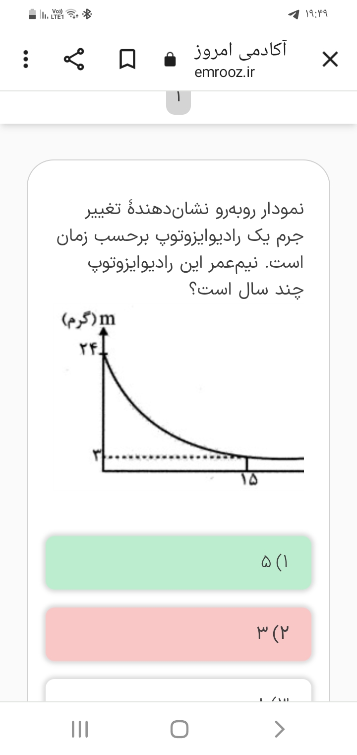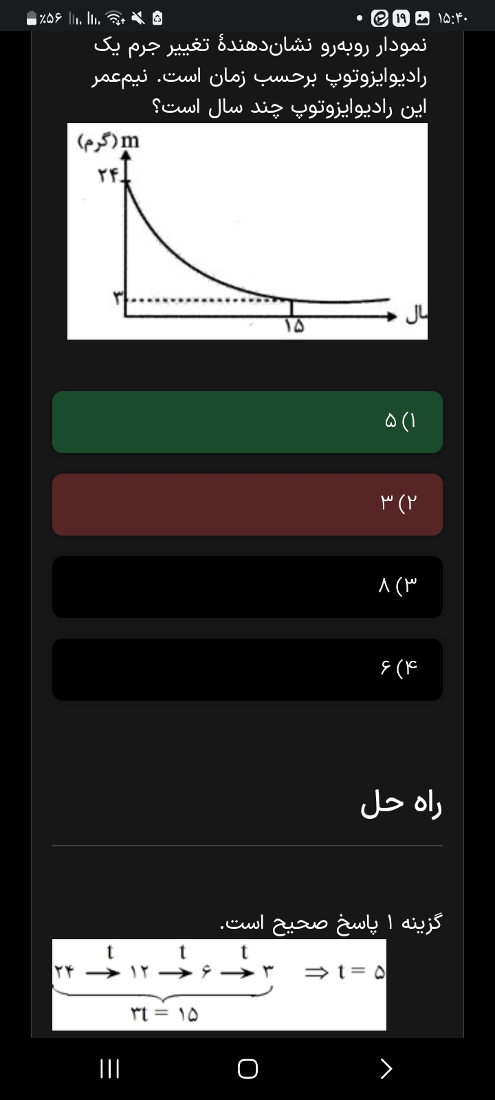 سلام ببخشید این چرا نشد ۳؟ اگه طبق مفهومی هم بریم خب جرم اولیه مون۲۴ هست بعد نصفش میشه ۱۲ بعدم میشه ۶ بعدم میشه ۳.. در واقع سه نیمه عمره که باقی مانده میشه، ۳.. اگرم طبق فرمول بریم بازم میشه ۳...