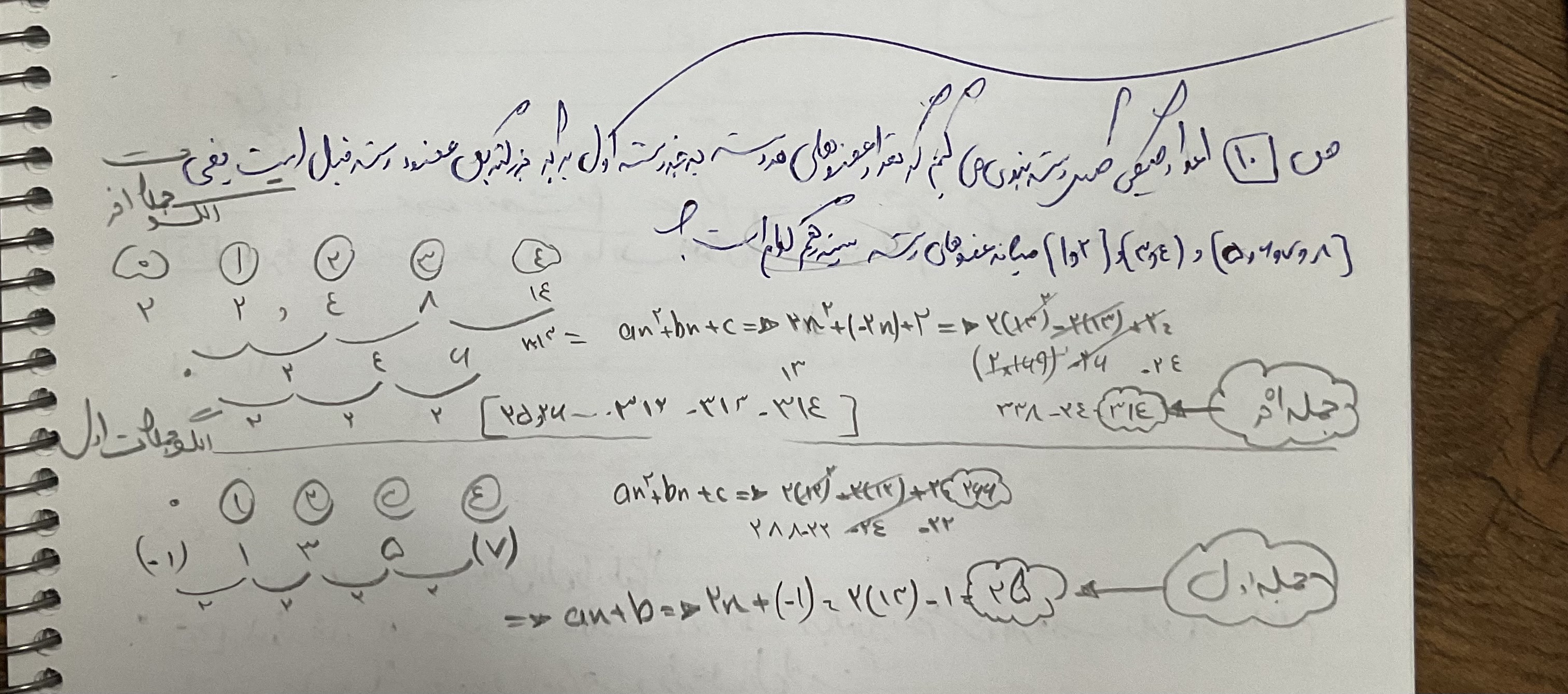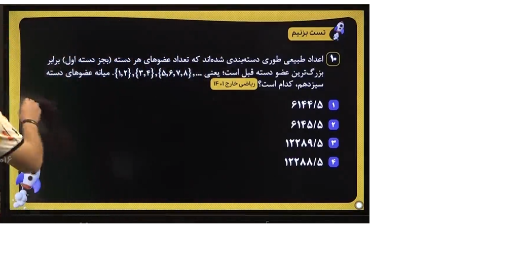 سلام وقت بخیر مشابه این تست ریاضی 1401 توی تست های 4و5 تدریس یادبگیریم 2 بود و اونجا استاد گفتند که برای حل این تیپ تست ها بیایین خواسته سوال رو برای هر دسته بنویسین و بعد از نوشتن ، یک دنباله درجه 2 تشکیل میشه و هر عددی که طراح خواسته بود رو جاگذاری کنید تا جواب بدست بیاد و من هم الان میانه رو برای هر دسته نوشتم ولی جواب درست نشد چرا؟