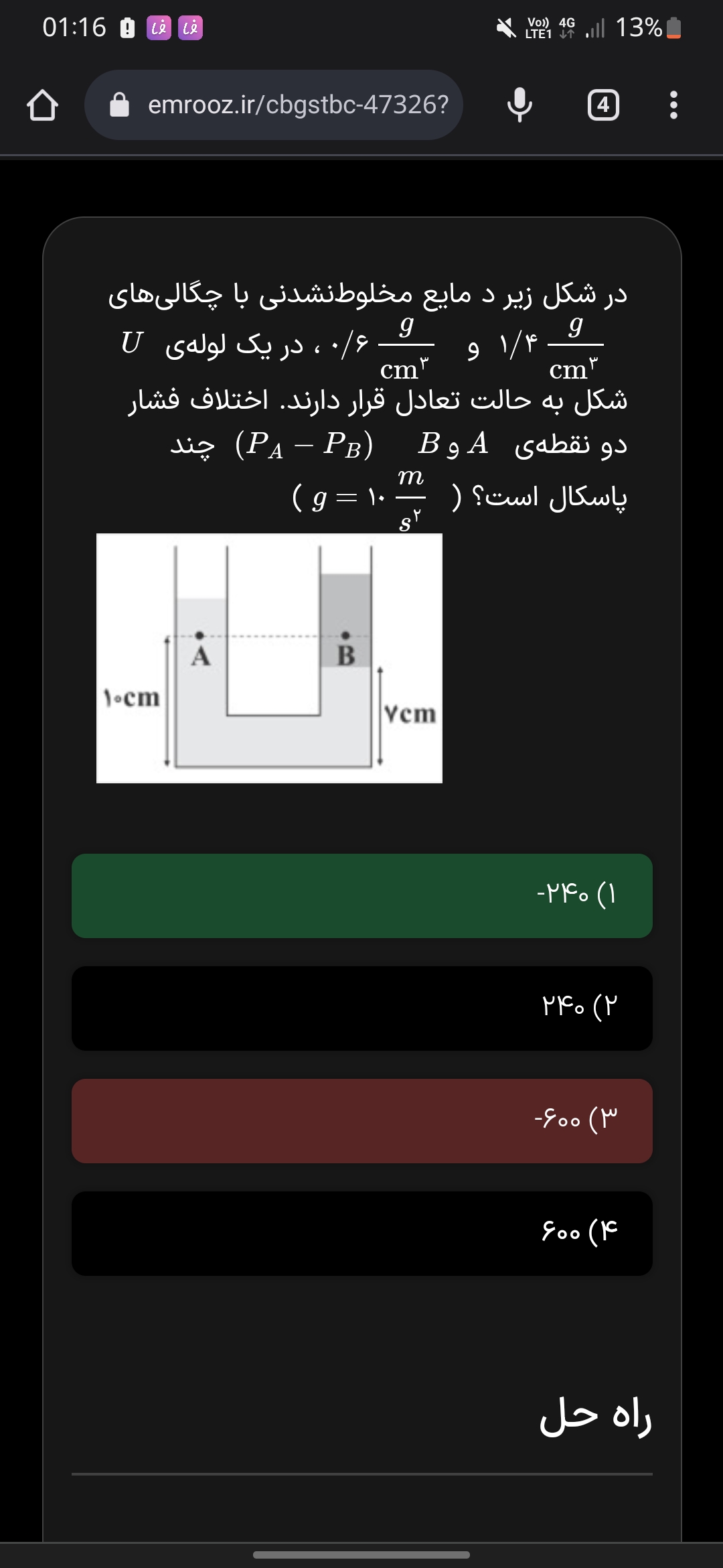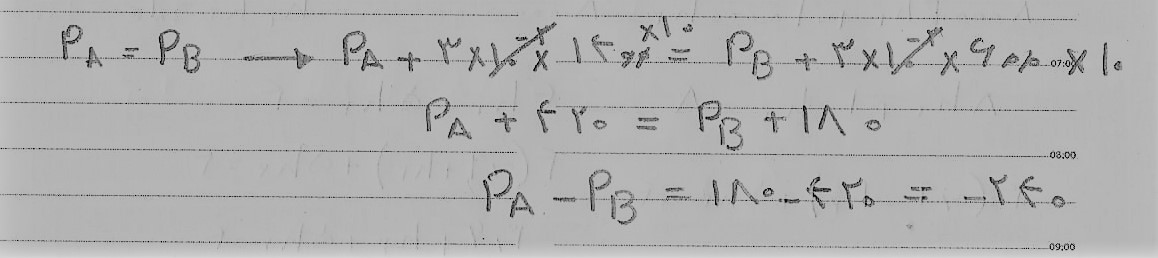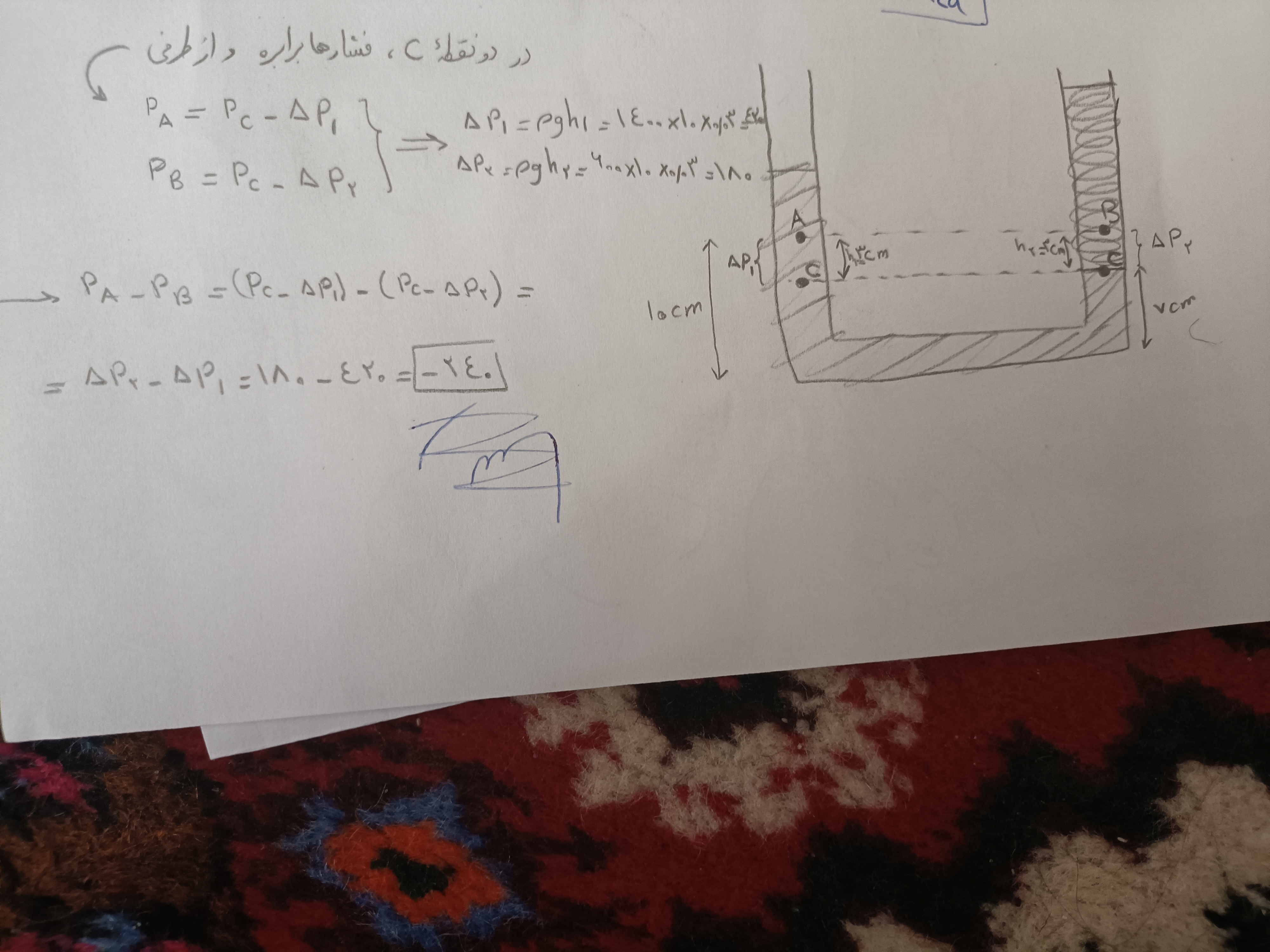 اینجا نقطه آ و بی در یک ارتفاع یکسان (یا تراز یکسان) قرار دارند و اختلاف فشارشونو خواسته با توجه چگالی مایع ها و ارتفاعشون حالا مشکلتون کجاست؟ من دقیق سوالتونو نفهمیدم