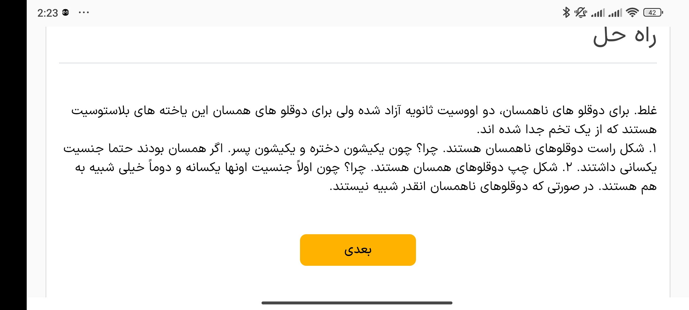 استاد توی همین فیلم گفتن دو قلو های همسان میتونن جنسیت متفاوت داشته باشن... اما این پاسخنامه میگه اگه همسان بودند حتما جنسیتاشون یکی بود...