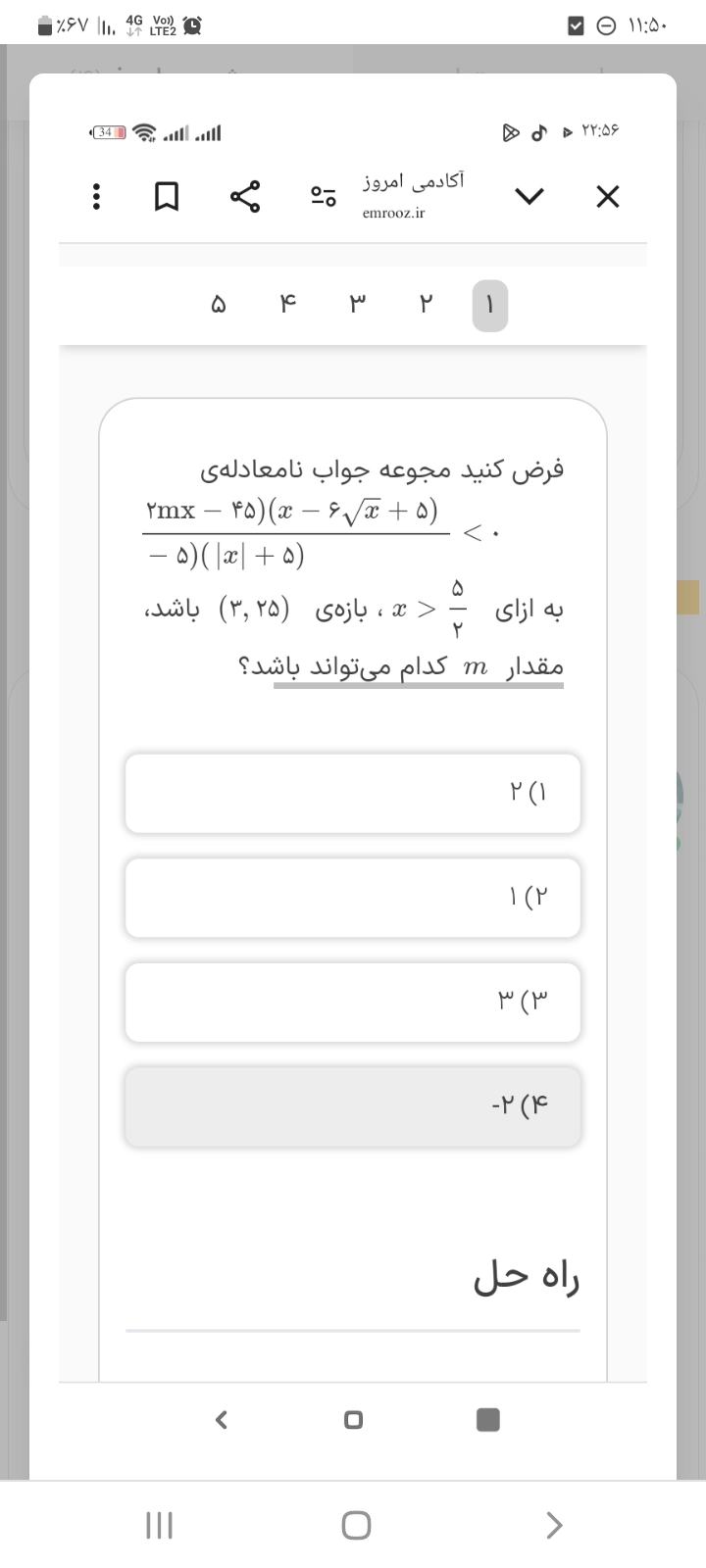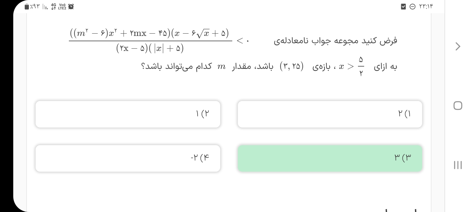 سلام برا این سوال نمیتونیم از روش تست 6 بریم یعنی تابع رو یه بار = 0 بگذاریم و ایکس بدست بیاریم یه بار =-2 بگذاریم و باز ایکسو بدست بیاریم بعدش بگیم این ایکس بین این دو عدد است و بعد اعداد صحیح بینشو بدست بیاریم اگه میشه میشه لطفا جوابو بفرستید