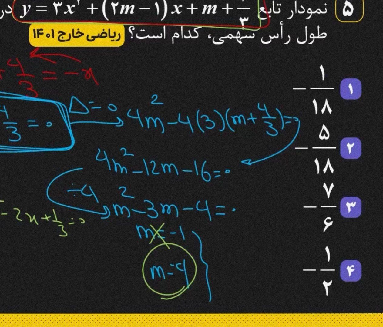 سلام یعنی این سهمی رو مساوی x- بزاری باید یک جواب داشته باشه این معادله چرا؟ چون توی سوال گغته مماس شده، یعنی یک نقطه تماس داریم و یک ریشه نیاز داریم