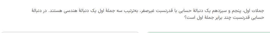 سلام اولین عدد میشه a1 مساوی ۴/۳ و عددپنجم میشه a1q4 که میشه ۲۷ اینا رو بر هم ساده کنی میتونی مقدار q رو بدست بیاری