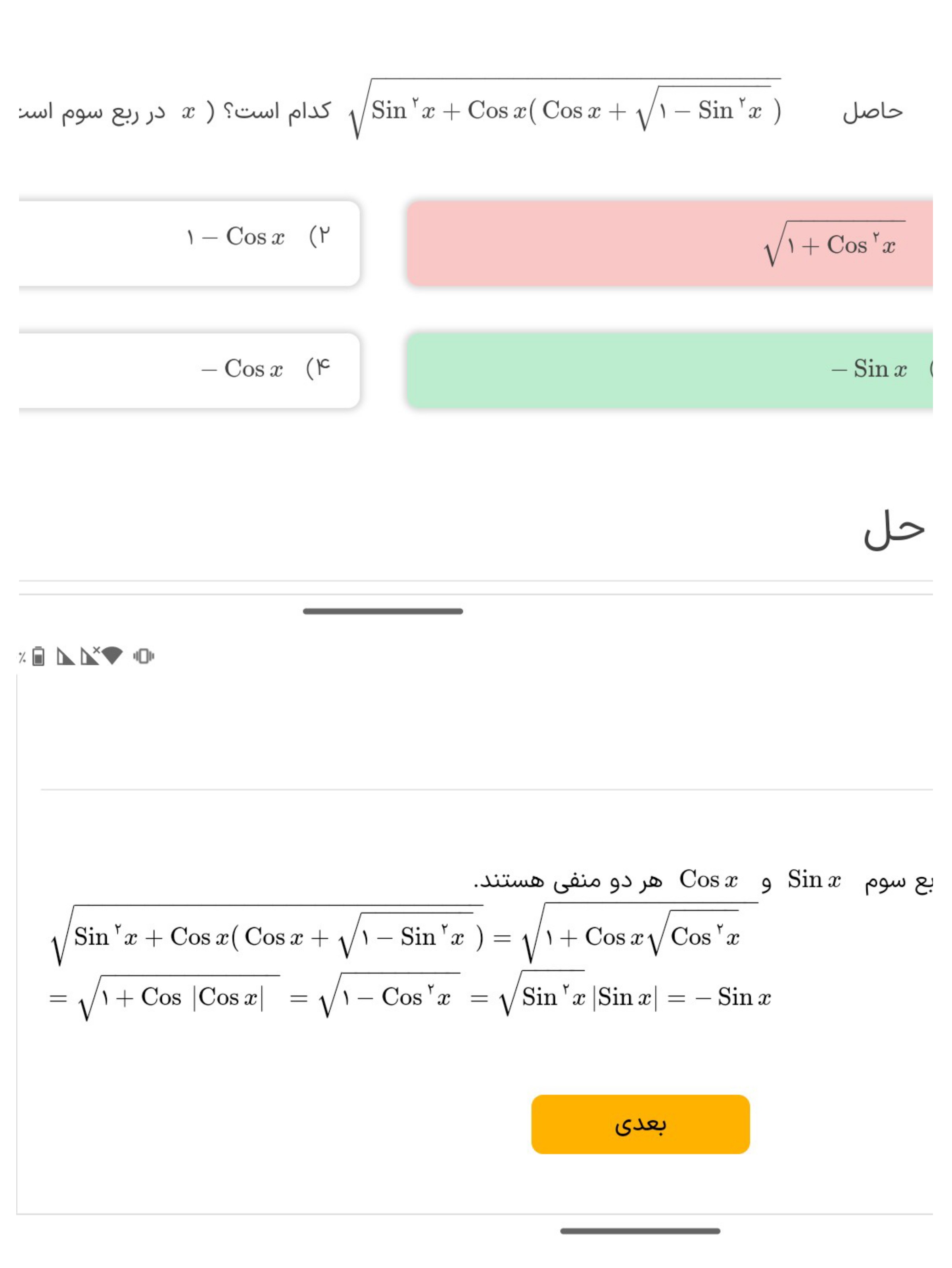 این سوال رو متوجه نمیشم ، چجوری سینوس دو زیر رادیکال تبدیل شده به یک ؟ و چجوری کسینوس ایکس به اضافه کسینوس ایکس ( اولین پرانتز ) شده کسینوس ² ایکس ؟