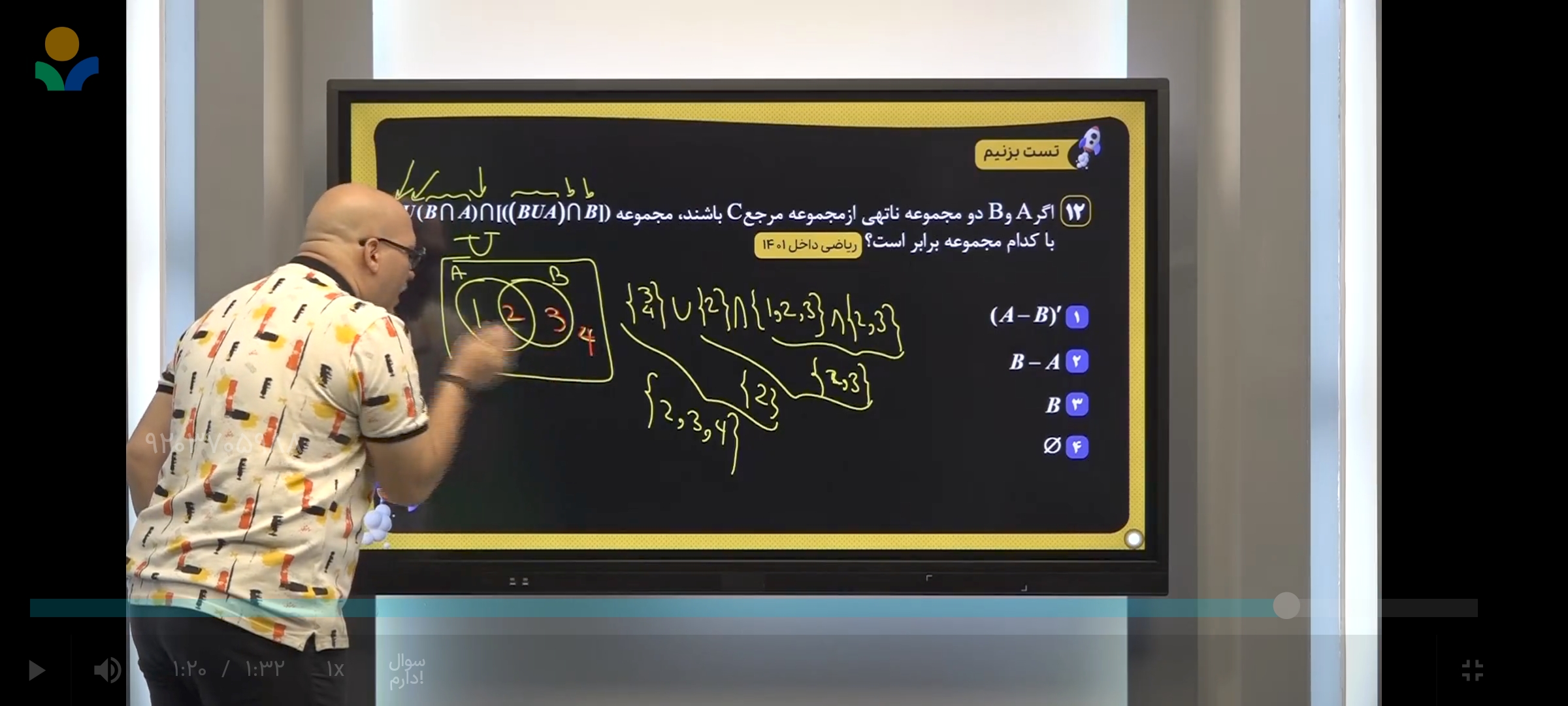 سلام خسته نباشید در این تصویر عبارت وسطیه رو استاد از انتها به ابتدا حل کردن یعنی اول گفتن اشتراک یک و دو و سه با دو و سه میشه. دو و سه و همین جور تا آخر ولی اگر ما بیاییم از اول این کار رو انجام بدیم میشه اجتماع سه و چهار با دو کمیشه دو و سه و چهار _ حالا اشتراک دو و سه و چهار با یک و دو و سه میشه دو و سه در ادامه اشتراک دو و سه با دو و سه میشه دو و سه ک همون مجموعه B هس پس جواب سه میشه حالا جواب استاد از انتها به ابتدا شد گزینه یک از ابتدا به انتها هم شد گزینه سه حالا نمیدونم کدوم درسته؟؟؟