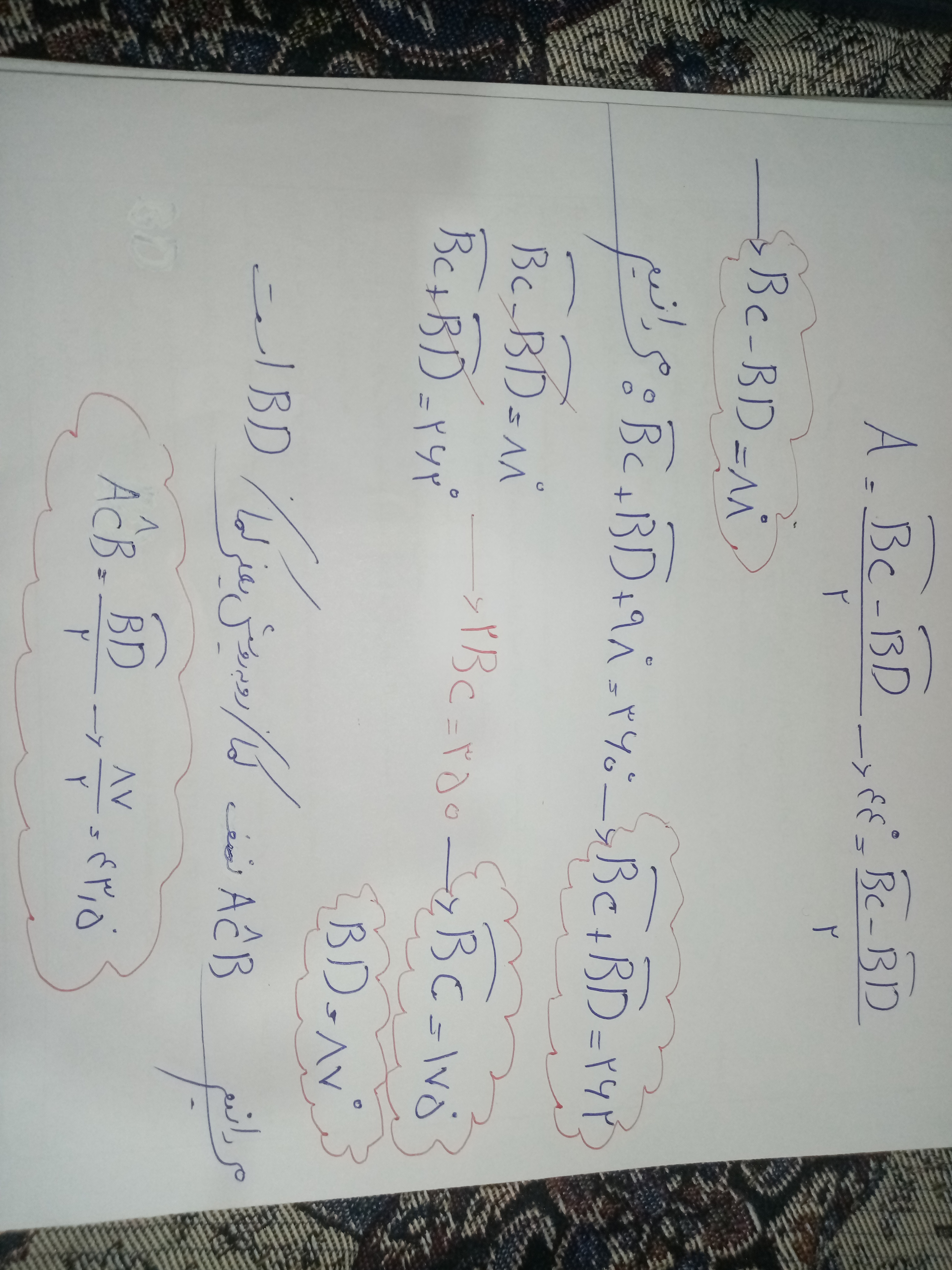 سلام از اونجایی که ao=co شعاع های دایره هستند و طبق داده های سوال که دو ضلع ab=bc برابرند نتیجه میگیریم که زاویه بالایی با پایینی یکسانن و از اونجایی b رو به رو به کمان 206 درجه است پس زاویه محاطیه و103 درجس که با 154 جمع میشه و میشه 257 360-257=2a از اینجا a بدست میاد