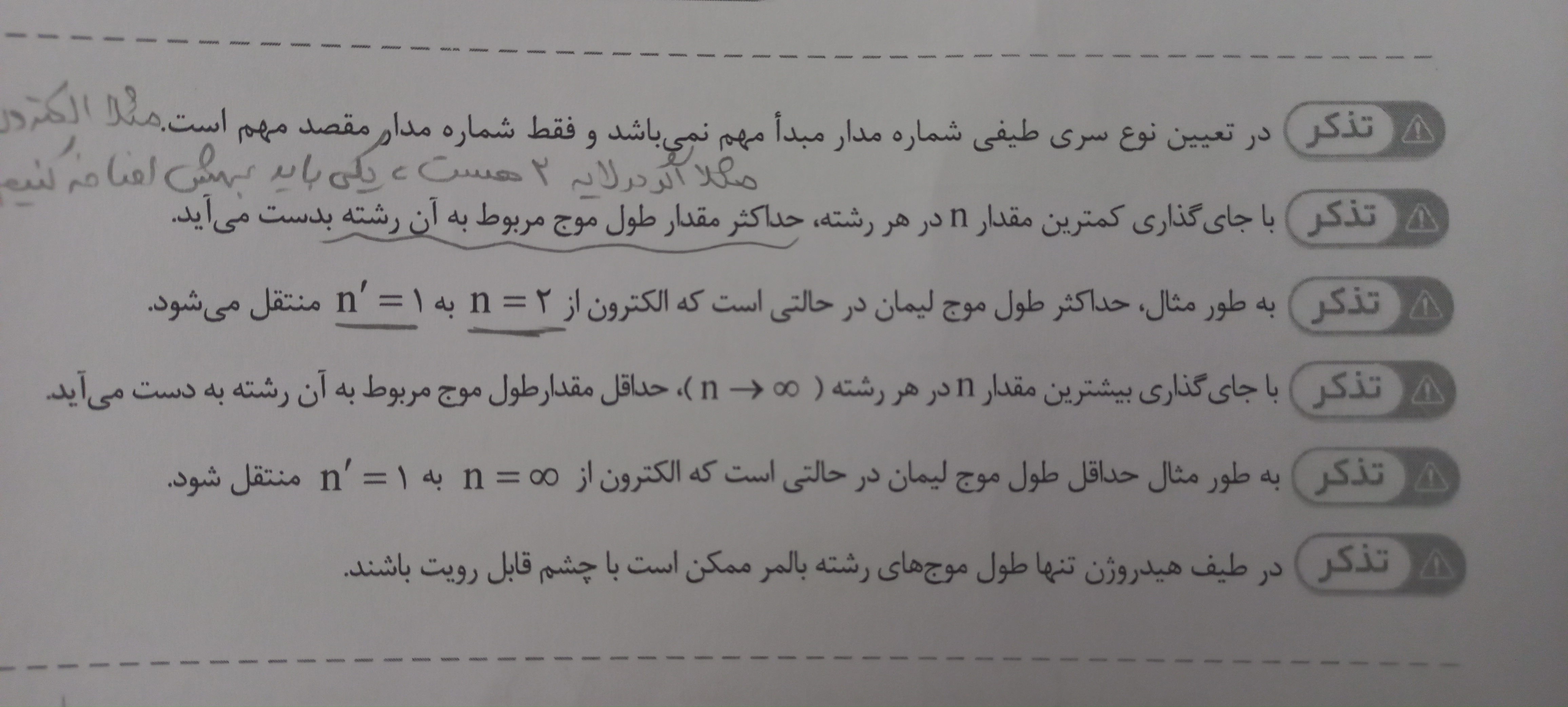 @نرگس مهدوی خب توی جزوه دقیقا برعکس چیزی که میگید نوشته شده ، من از همین گیج شدم اینجا برای حداقل و حداکثر طول موج در هردو حالت گفته باید به n=1 بیایم تذکر ۲ ، ۳ ، ۴ و ۵ رو نمیفهمم اصلا