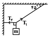 در شکل زیر اگر T۲ = ۴۰N باشد، جرم وزنهی ‌آویخته شدن چند کیلوگرم است؟ (g = ١۰ms۲)