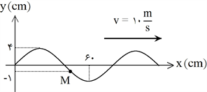 شکل مقابل، نقش یک موج عرضی را در لحظه t = ۰ نشان میدهد. تندی متوسط ذره M‏ در بازه زمانی t = ۰ تا t = ۰ ۰۴ s چند متر بر ثانیه است؟