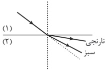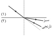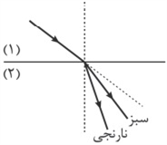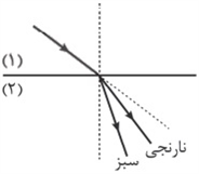 شود. حال کدام گزینه مسیر پرتوی نور شامل سبز و نارنجی را از محیط (۱) به محیط (۲) درست نشان می