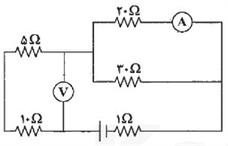 اگر آمپرسنج مقدار ۲‏/۱‏ آمپر را نشان دهد، ولتسنج چند ولت را نشان میدهد؟ (ولتسنج و آمپرسنج هر دو ایدهآل هستند.)