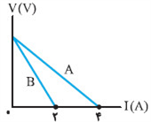 نمودار تغییرات اختلاف پتانسیل دو سر مولد برحسب جریان برای دو مولد A‏ و B‏ مطابق شکل داده شده است، بیشترین توان خروجی مولد A‏ چند برابر مولد B‏ است؟