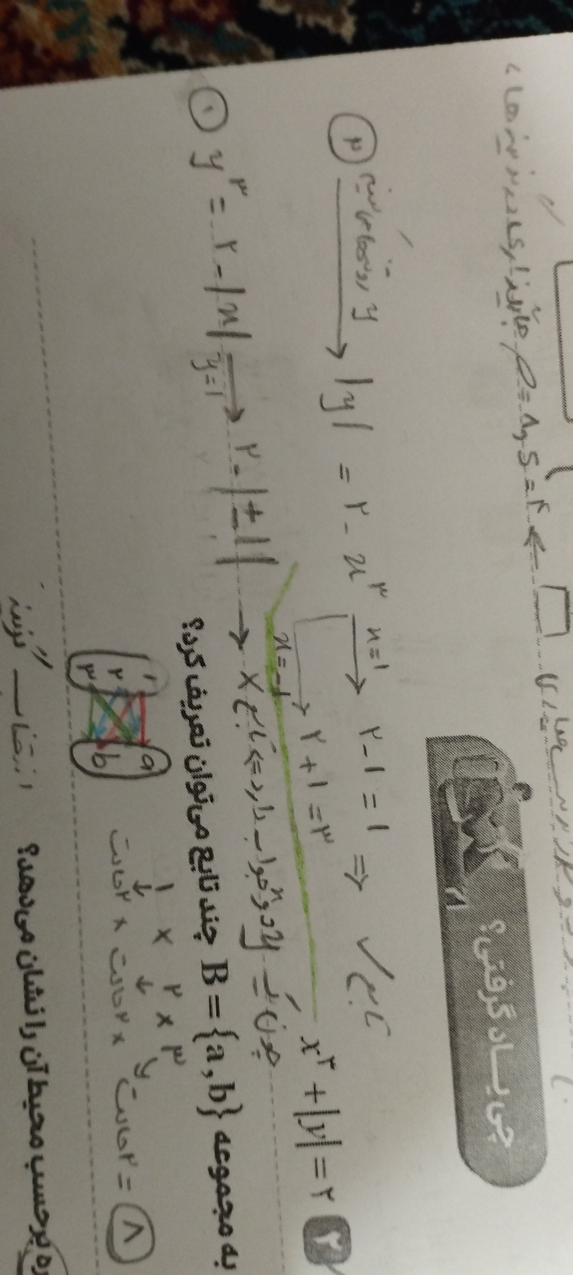سلام روز خوش منم اولی رو نفهمیدم جوابم جور در نماد ولی دومی: اعداد دامنه کلا ۳ تا هستن و اعداد هم دامنه ۲ تا،اعداد دامنه هر کدوم دو حالت دارن ک رابطشون تابع بشه مثلا ۱ هم میتونه ب a وصل بشه همb پس در کل سه تا عدد ک هرکدوم ۲ حالت دارن میشه ۲×۲×۲=۸ حالت مثل فرمولای آمار و احتمال فصل اخر ریاضی دهم