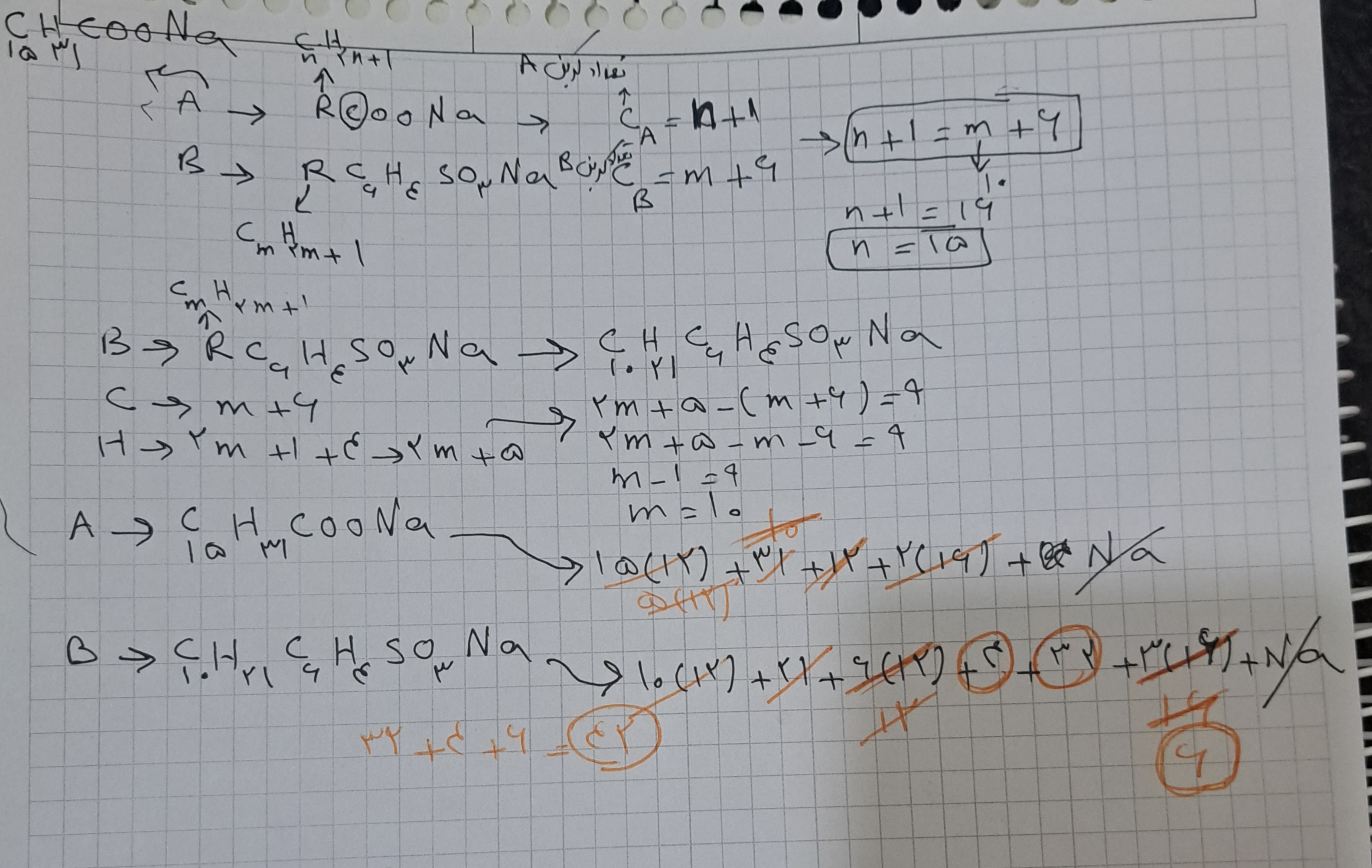@Reyhan V مراحل رو نوشتم که اول فرمول مولکولی رو مینویسی بعدش برا صابونی اومده نوشته دوگانه داره پس دوتا هیدروژن کم میکنم تا اینجا مثل روش استاد بعدش دیگه عدد گذاشتم مثلا کربن هردوتارو هفت دادم برا اولی یه گروه حلقهای که داره پس اونجا ۶تا داره پس اون کربن یکیه که شده هفت تا پس n:1 جاگذاری میکنم تو فرمول هیدروژن رو بدست میارم بعد با اون چهارتا هیدروژن حلقه جمع میکنم الان شده هفت میرم سراغ بعدی اگه شمار کربن هفت باشه یکیش مربوط گروه عاملی پس m:۶ جاگذاری میکنم هیدروژن بدست میاد اختلاف بدست میارم