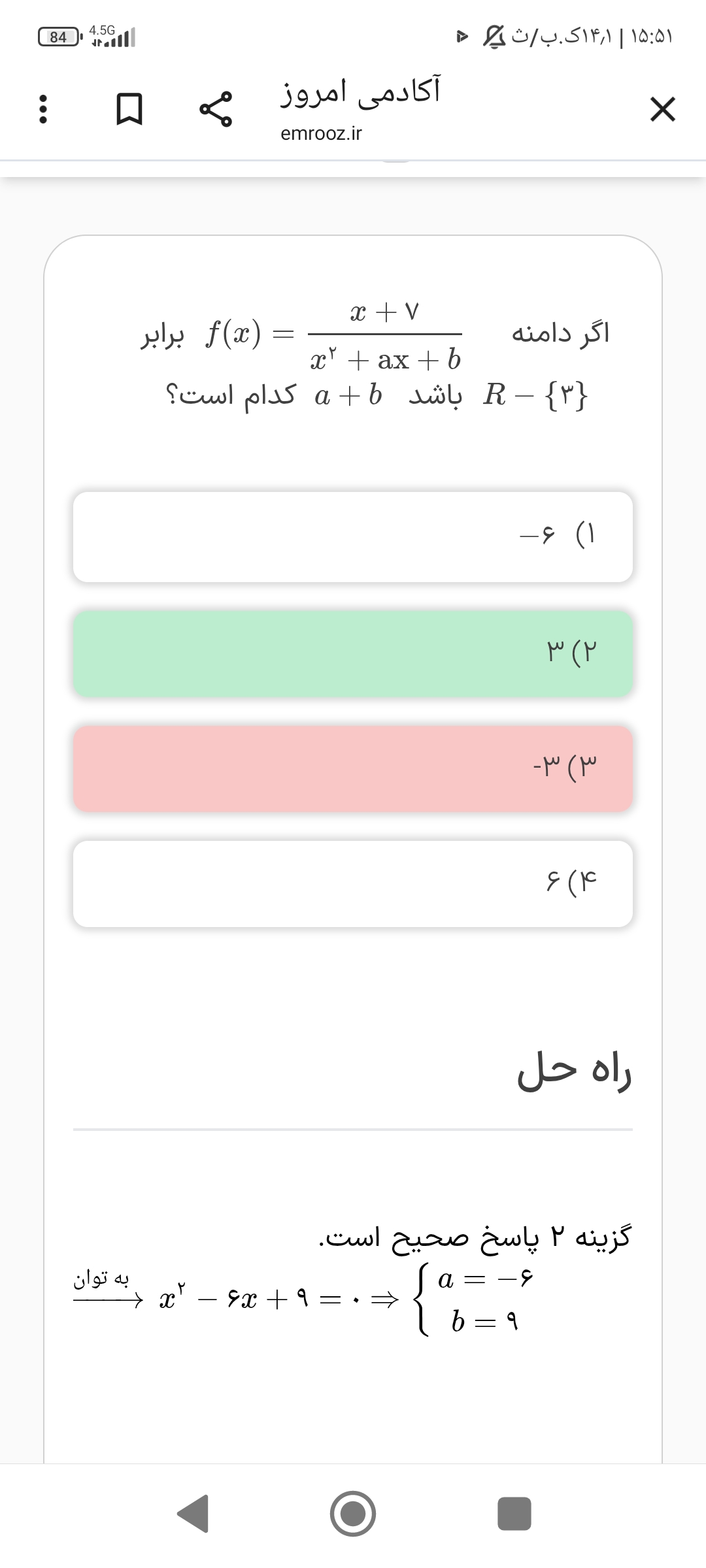 سلام من اینو از روش s و p رفتم جواب درست دراومد ولی وقتی مخرجو به جای x هاش ۳ گذاشتم مساوی صفر قرار دادم شد گزینه سه نمیدونم چرا