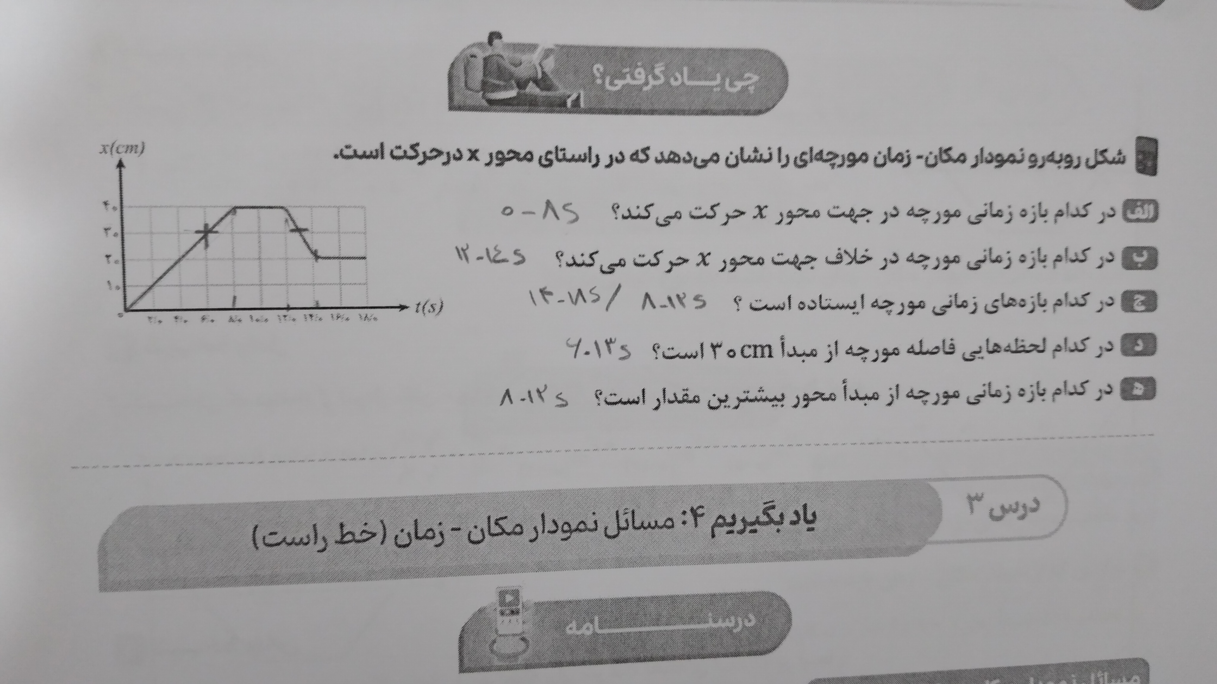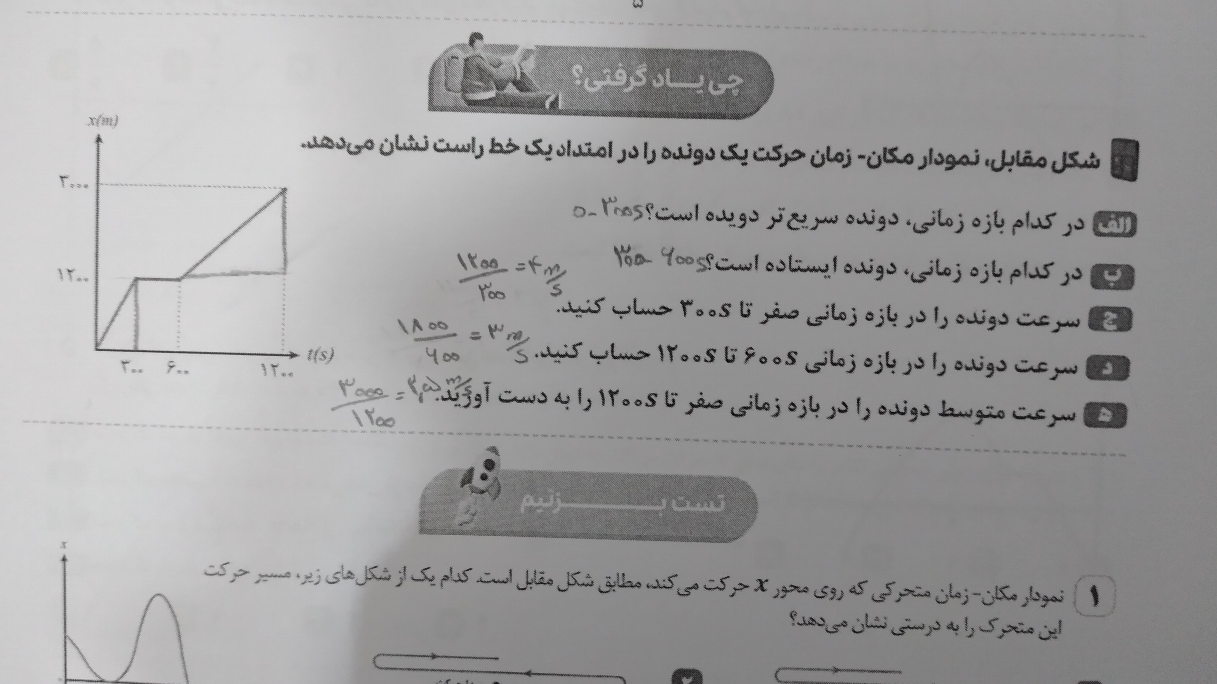 سلام جواب یادبگیریم طبق جوابای خودتون در سوال 3 و 4 اون سوال 1 رو اشنباه گفتید در بازه ی 0 تا 300 ثانیه با سرعت 4 متر بر ثانیه دویده و در بازه ی 600 تا 1200 ثانیه با سرعت 3 متر بر ثانیه بر در بازه ی 0 تا 300 ثانیه تند تر از 600 تا 1200 ثانیه دویده و بدون داشتن اعداد و سرعت اونها شیب خط بین بازه ی 0 تا 300 ثانیه نسبت به شیب خط بین بازه ی 600 تا 1200 ثانیه بیشتره و هرجا که شیب خط بیشتر باشه سرعت اون بیشتره