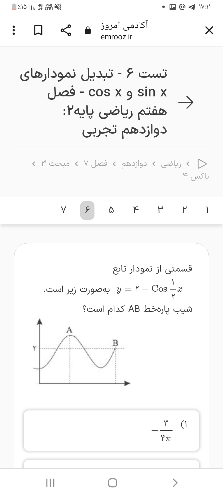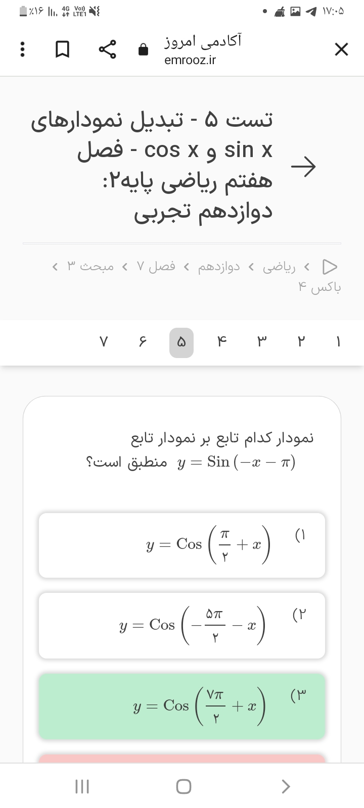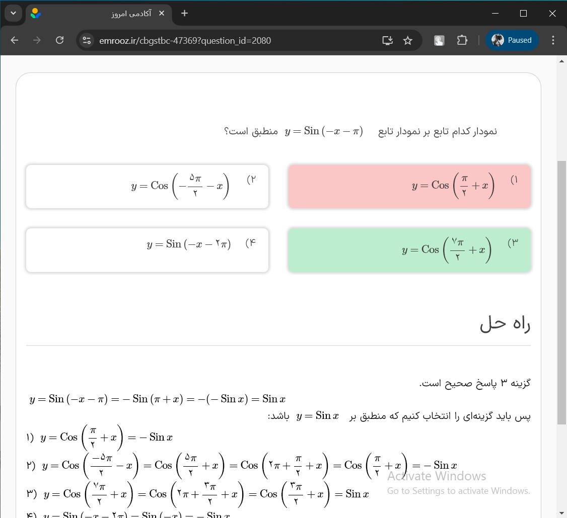سلام انگار شما نمودار سینوس رو به اندازه ۹۰ درجه به سمت راست میبری باید ببینی شبیه به کدوم گزینه میشه البته میتونی از راه حل تشریحیش هم استفاده کنی