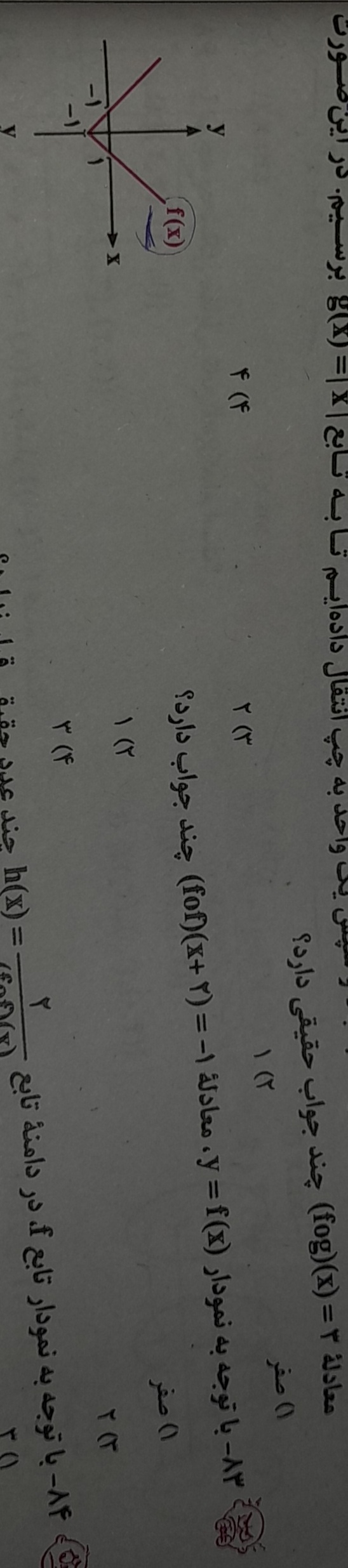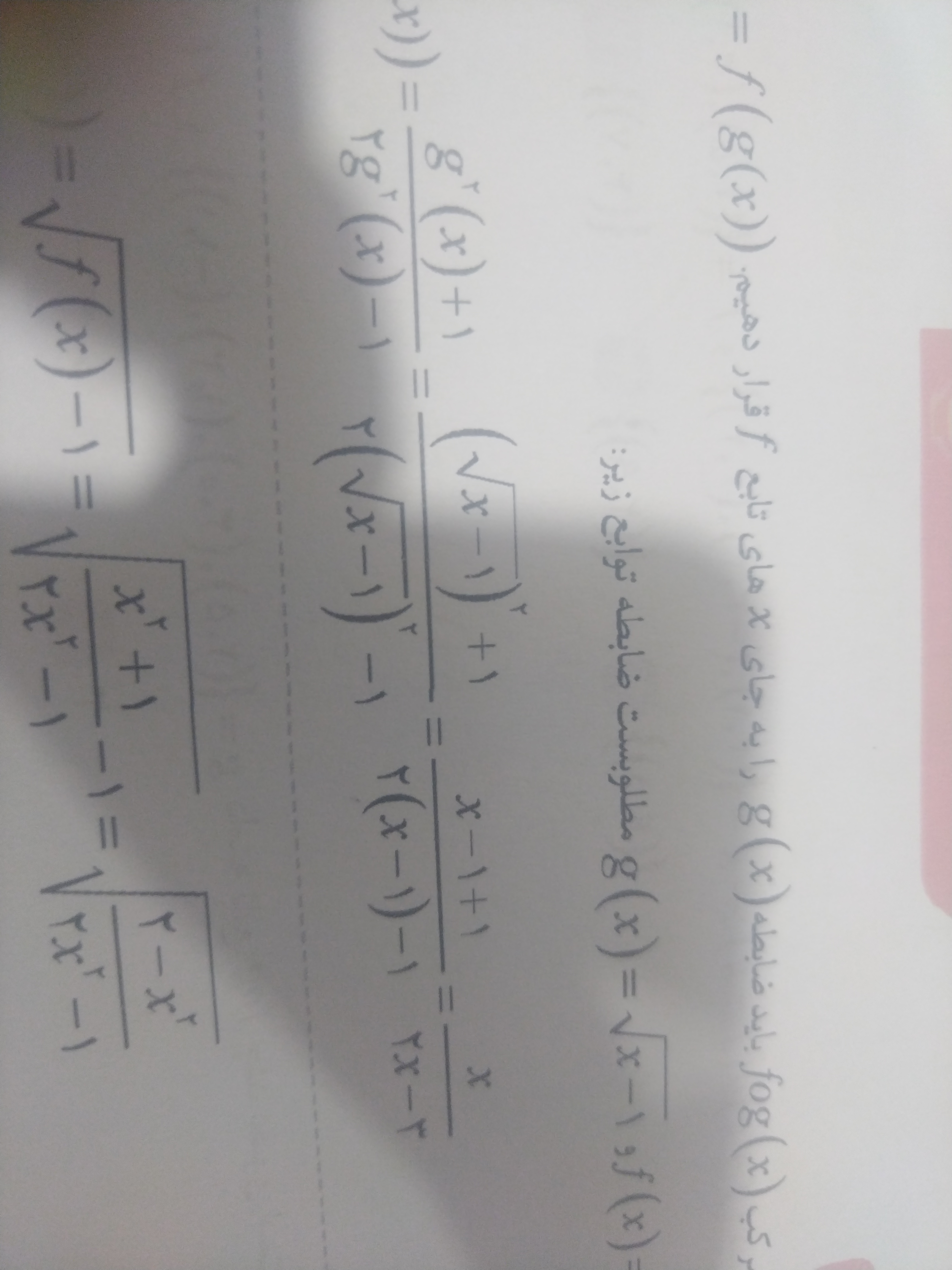 چرا میشه؛ عدد یک بزاری توی تابع f جواب "دو" میشه حالا این دو رو داخل تابع g قرار بدی جواب "یک" میشه یعنی بهازای عدد یک جواب ضابطه باید یک بشه و این ضابطه توی گزینه یک هستش