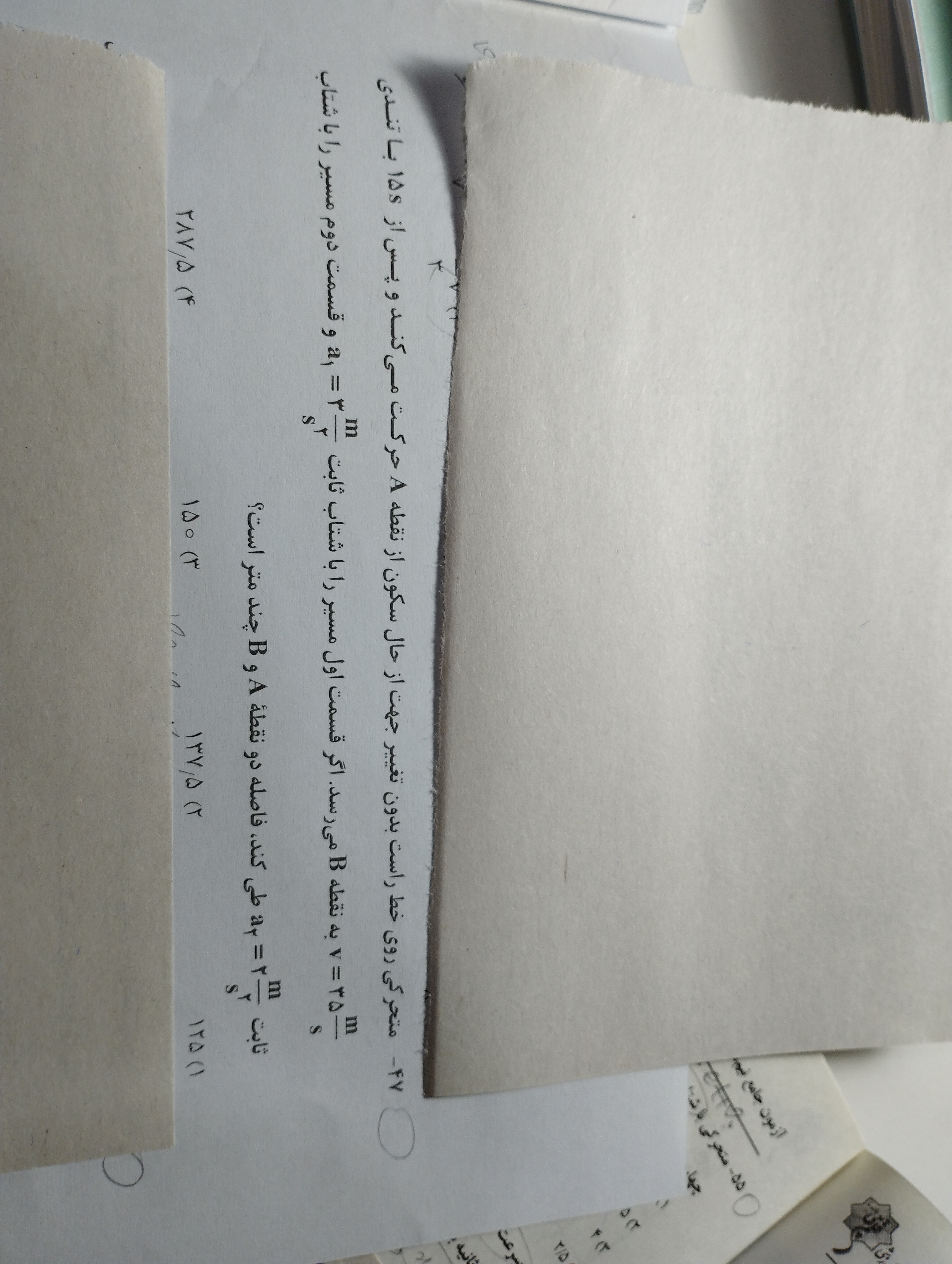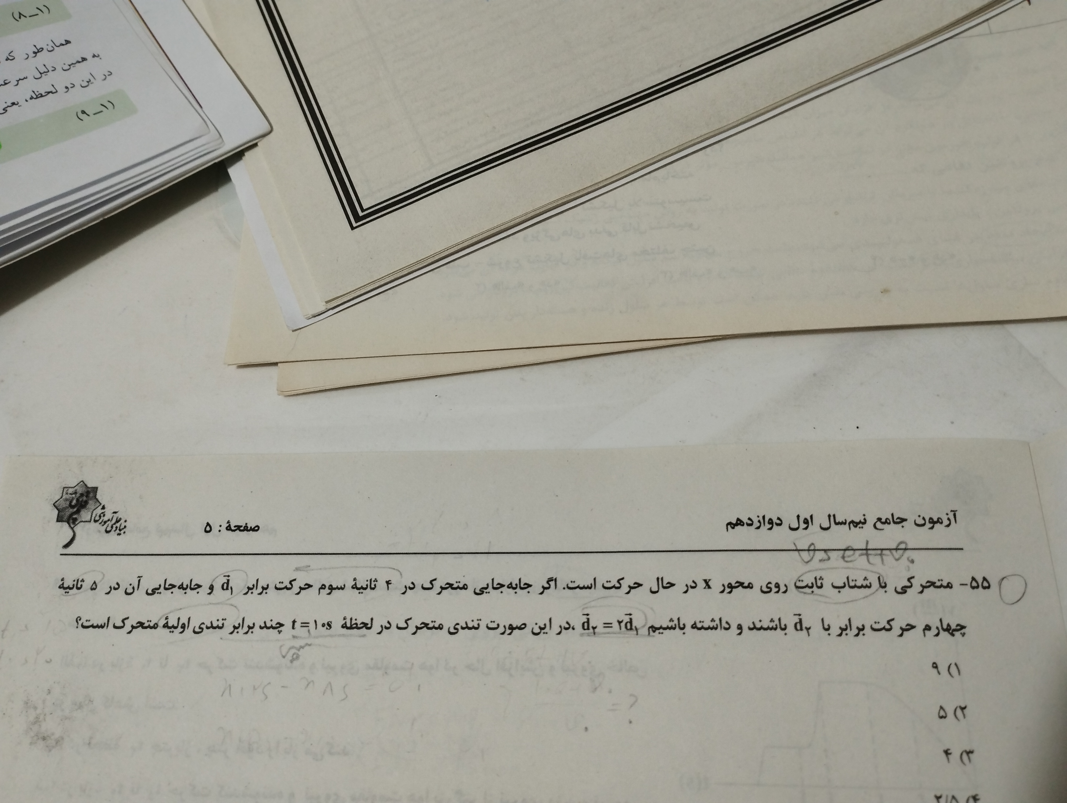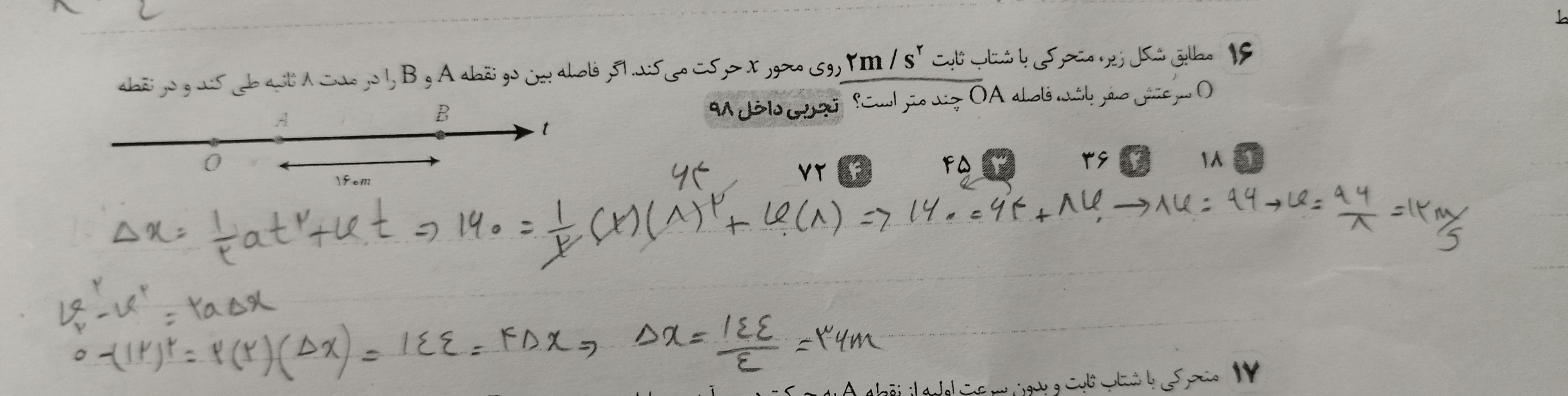 سلام واسه کسایی که این سوال واسشون مبهم بود این سوال رو بنده به یک روش دیگر حل کردم و از تشابه در مثلث ها استفاده کردم امیدوارم مفید باشه واستون، یک توضیحی هم میدم در مرحله اول از مساحت محصور نمودارvt استفاده کردم که جابه جایی میده و چون جابه جایی و مسافت برابر نیست یعنی تغییر جهت داشتیم که یعنی باید نمودار vt قطع بشه با استفاده از سطح محصور و تشابه در مثلث ها لحظه تغییر جهت رو حساب کردم و بعد با به دست اوردن سرعت اولیه، شتاب رو از رو شیب نمودار به راحتی میشه حساب کرد و در اخر مساحت محصور در ۲ ثانیه اول رو بدست اوردم که همون مسافت هست.