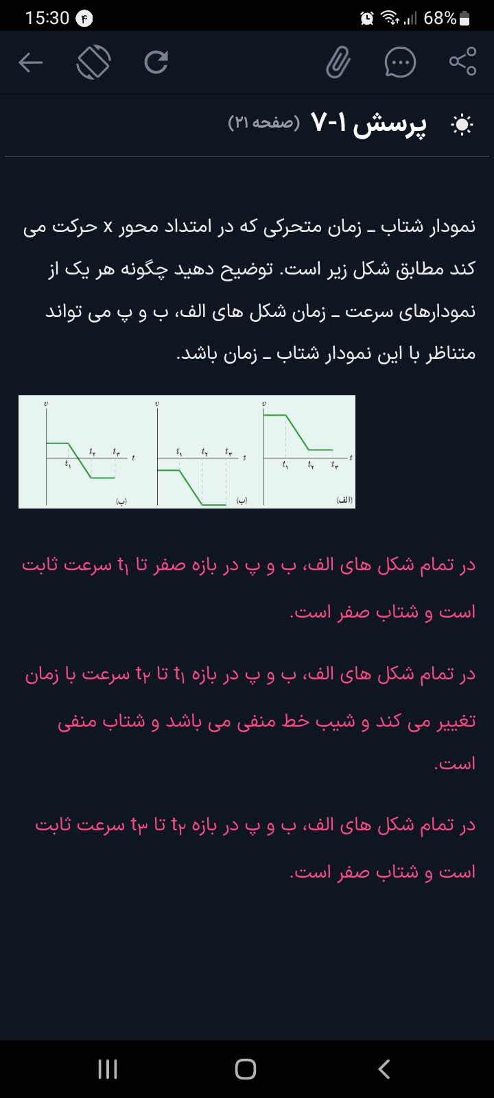 سلام من چی یاد گرفتید رو متوجه نمیشم حتی با توجه به گفته های آقای درویش یزدی آخه توی این نمودار ها شیب t1 . تا T2 تو هرسه منفیه و ۰ تا t1 وt2تاt3 ام واسه هر سه تا شتاب صفره و سرعت ثابته