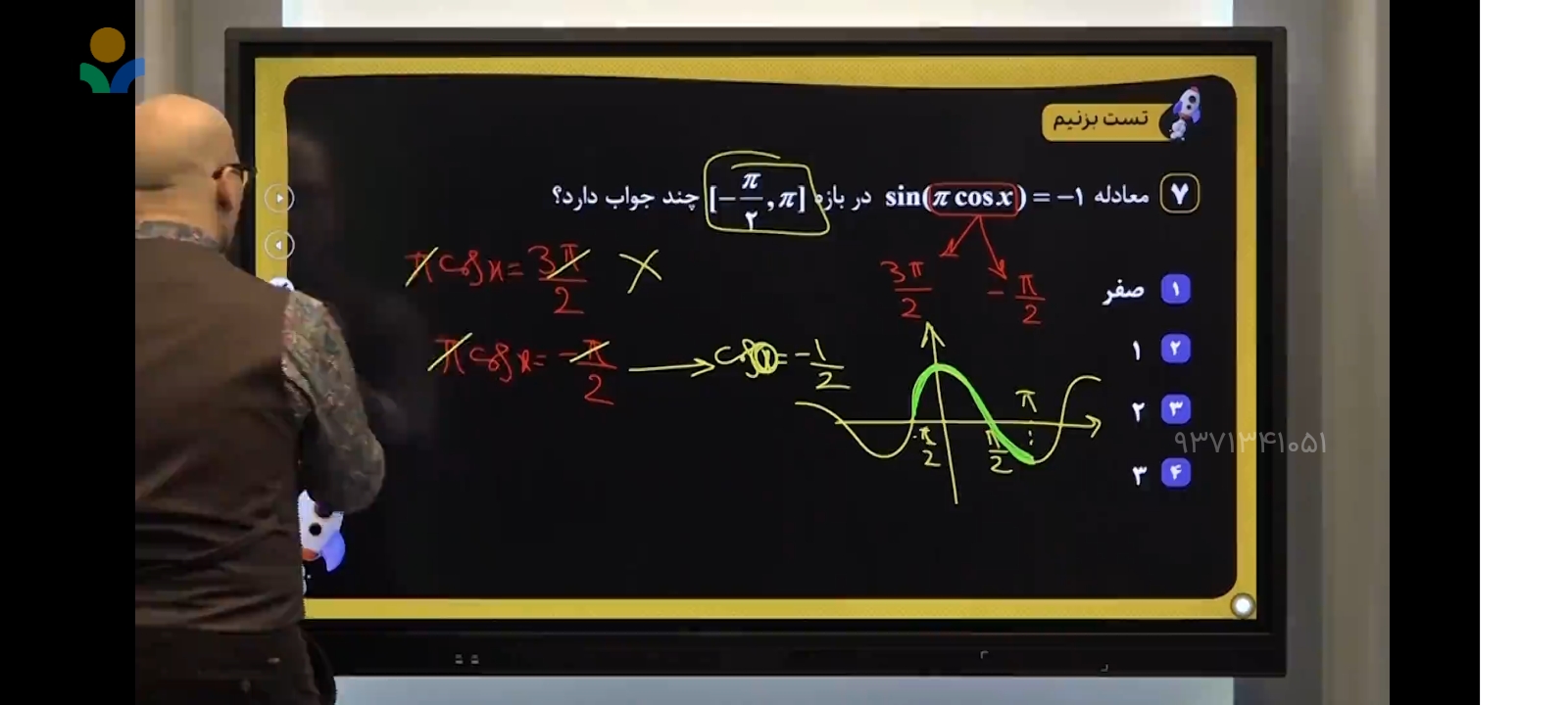 عزیزم بحث «هم » و «یا» عه تو سئوال 9 باید مقدار x «هم» کسینوس x «هم» کسینوس 2x «هم»کسینوس 3x را باید برابر 1 میکرد ولی تو این سئوال «یا» x باید سینوس دو ایکس رو صفر میکرد میکرد «یا» 1+کسینوس 3 ایکس رو