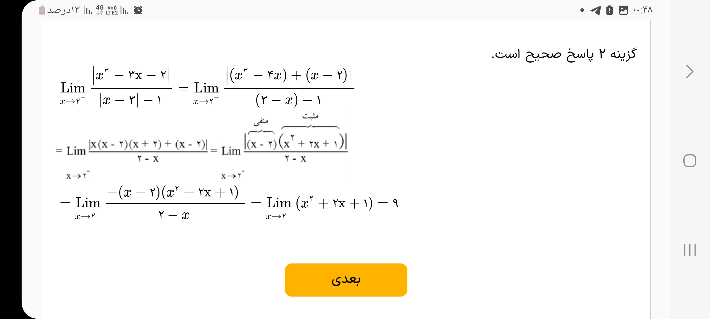 ببخشید مثال استاد برای گزینه دوم اشتباه نیست؟ مگه استاد نگفتن اگه داخل براکت عدد صحیح بشه تابع حد نداره؟! پس گزینه دوم از ۳ براکت بگیریم تابع حد نداره درسته؟؟