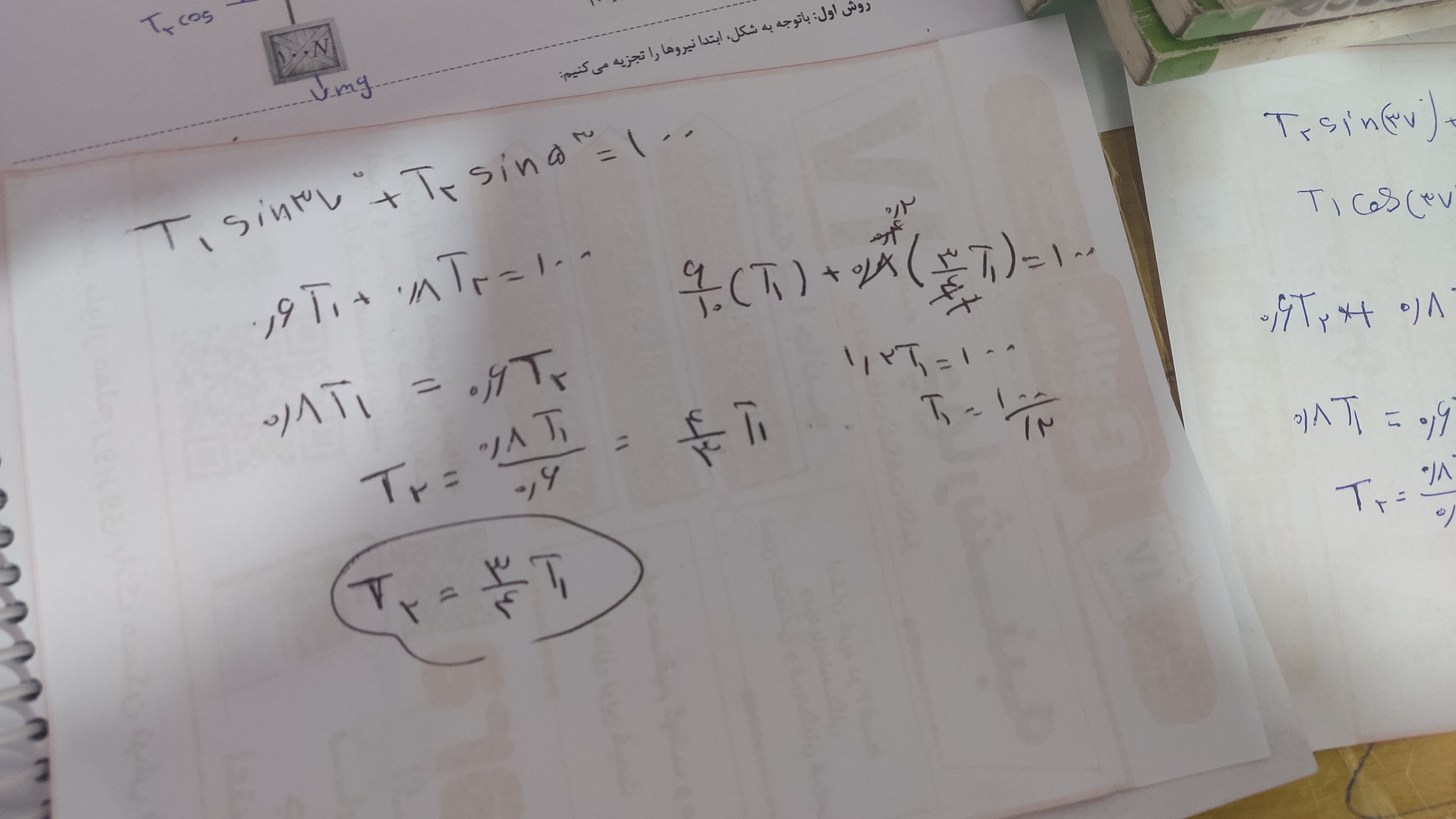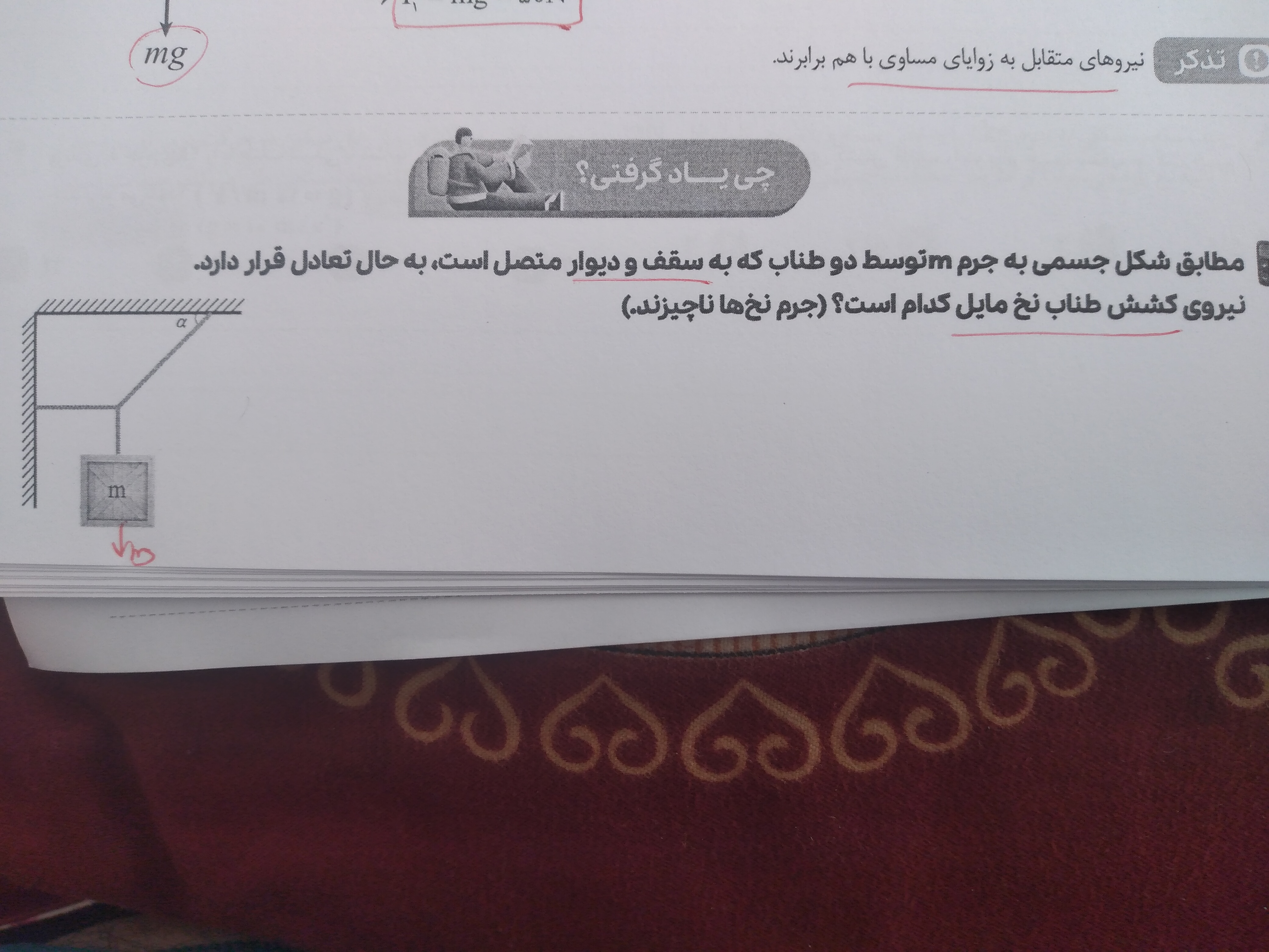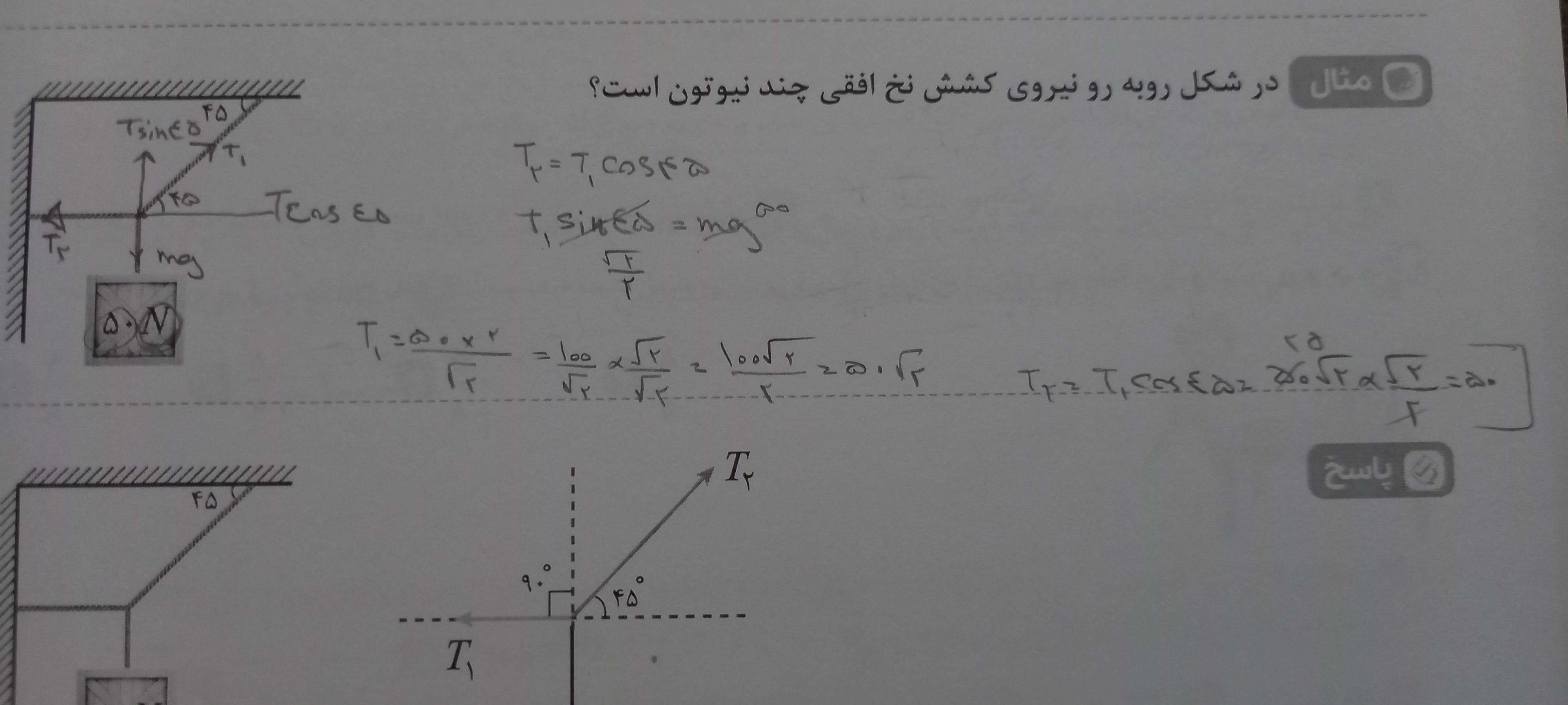 درود بر شما..خسته نباشید ببخشید برای یادبگیریم یک قسمت (ب) نیروی کشش نخ T هست درسته؟ بعد میگیم برای اینکه نیروی کشش نخ رو حساب کنیم فرمولش میشه T=mg که جواب میشه..T=10*9/8 T=98 درسته؟