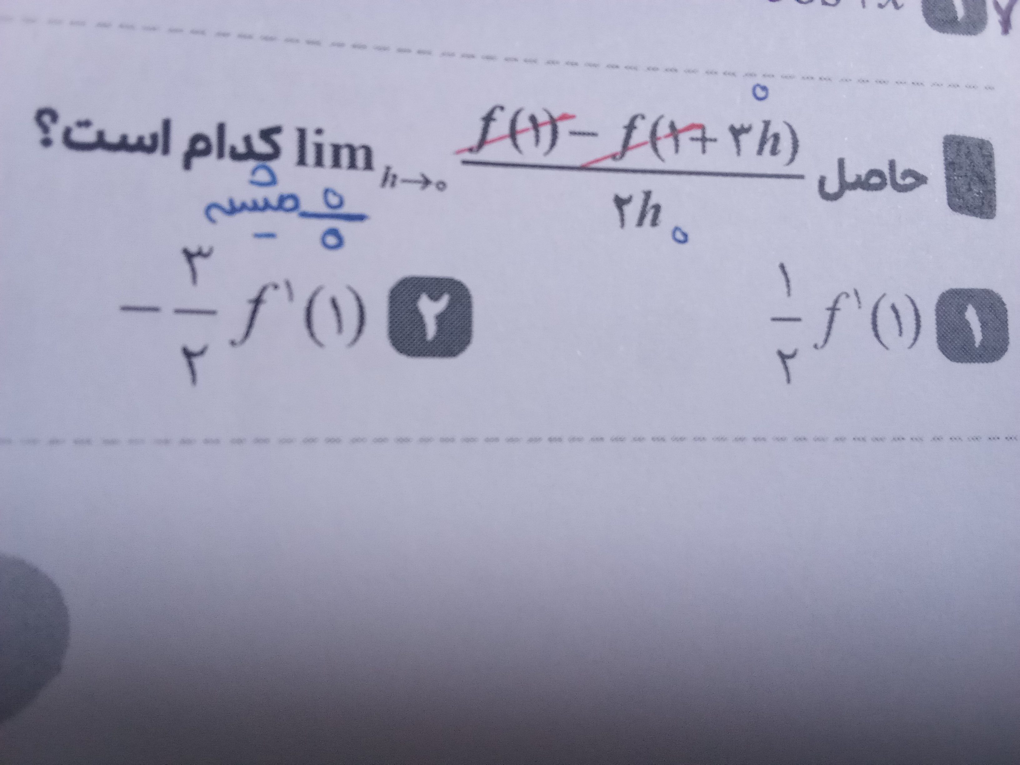 کافیه هوپیتال بزنی و بعدش h رو صفر جایگذاری کنی هوپیتال بزنی مخرج میشه ۲ صورت میشه منفی ۳ در اف پریم ۱+۳h حالا بجای h بذاری صفر،جواب آخر میشه منفی سه دوم در اف پریم یک