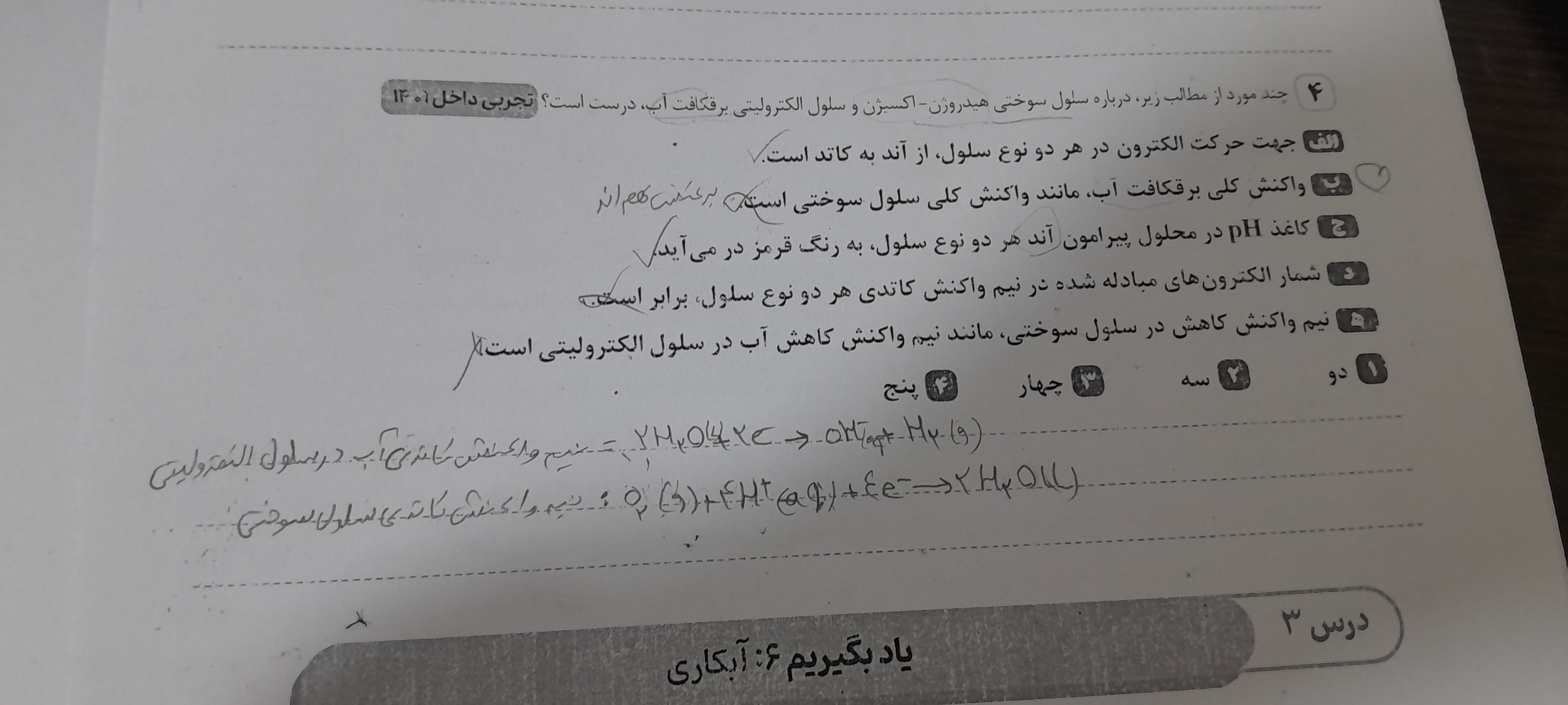 سازمان سنجش این تست رو دو مورد درست گرفته و مورد 4 رو غلط گرفته چون سوال نگفته در واکنش کلی پس باید همون واکنش کاهش هر سلول رو مقایسه کنیم و میشه 4 الکترون برای کاهش در سلول سوختی و 2 الکترون در کاهش برقکافت اب