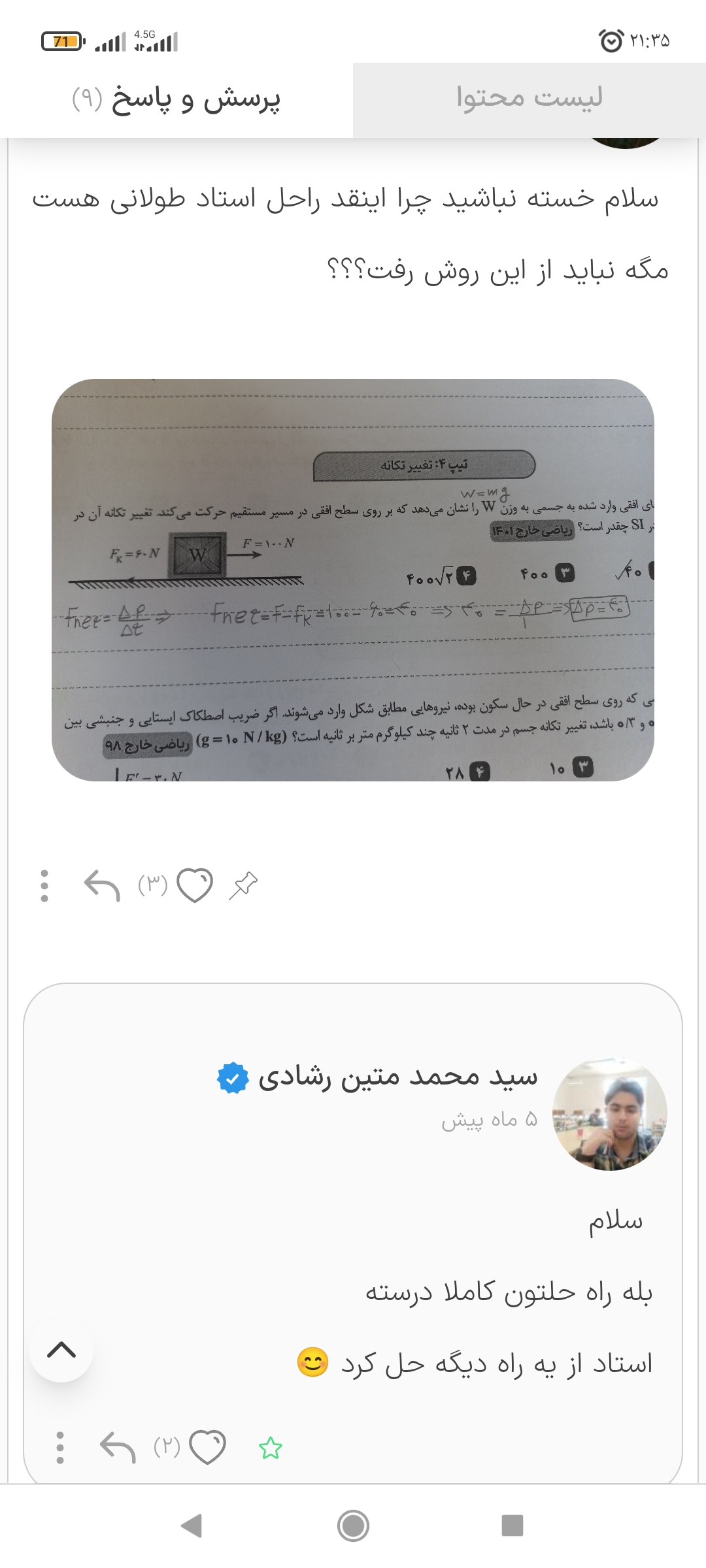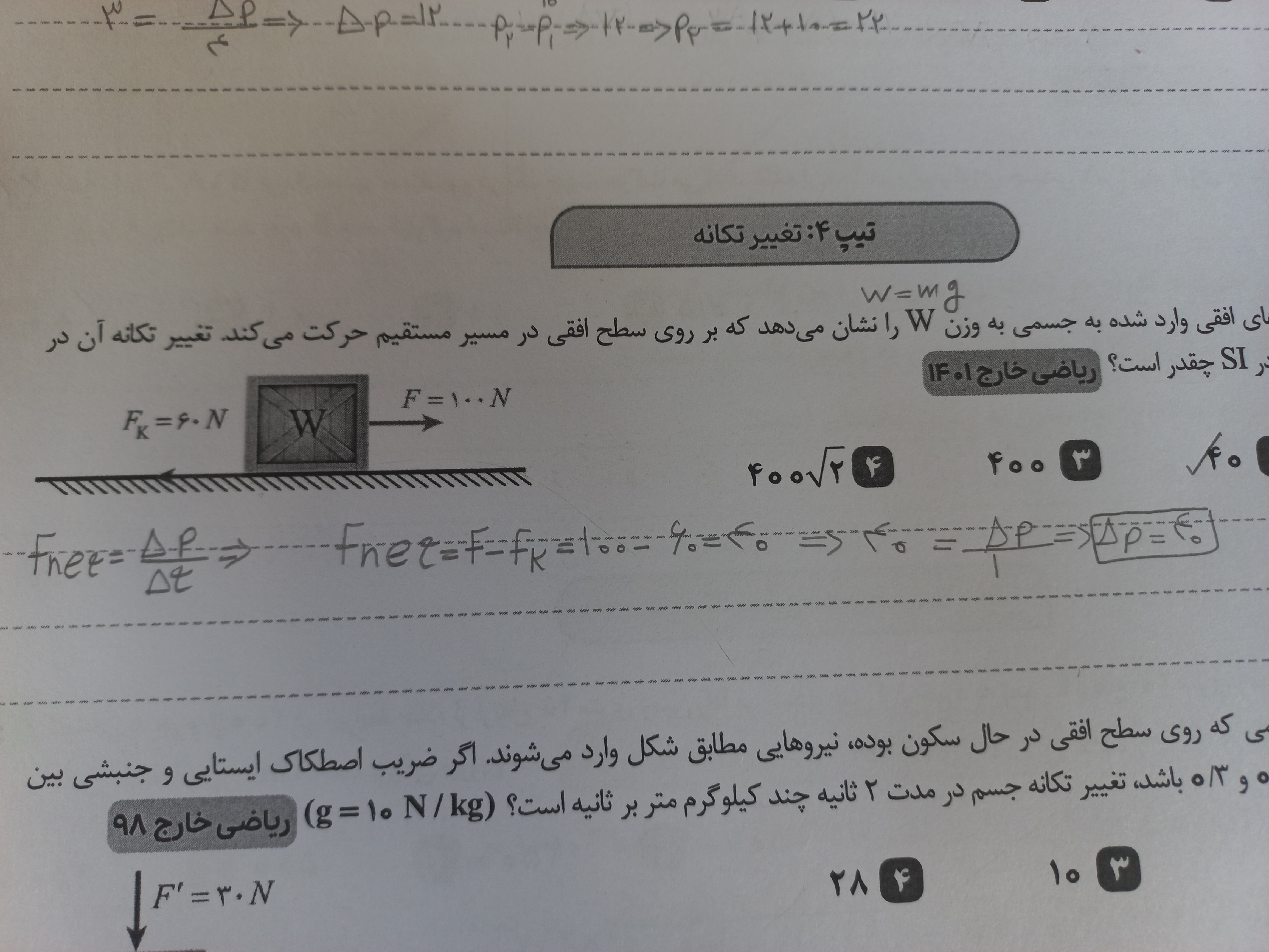 @سید محمد متین رشادی منظورم همون t3 بود و اشتباهی نوشتم خب t2 تا t3 سرعت و تکانه ثابته و در نتیجه تغییر سرعت و تکانه در صفر تا t3 و صفر تا t2 ثابته و نیروی متوسط در این بازه ها برابره