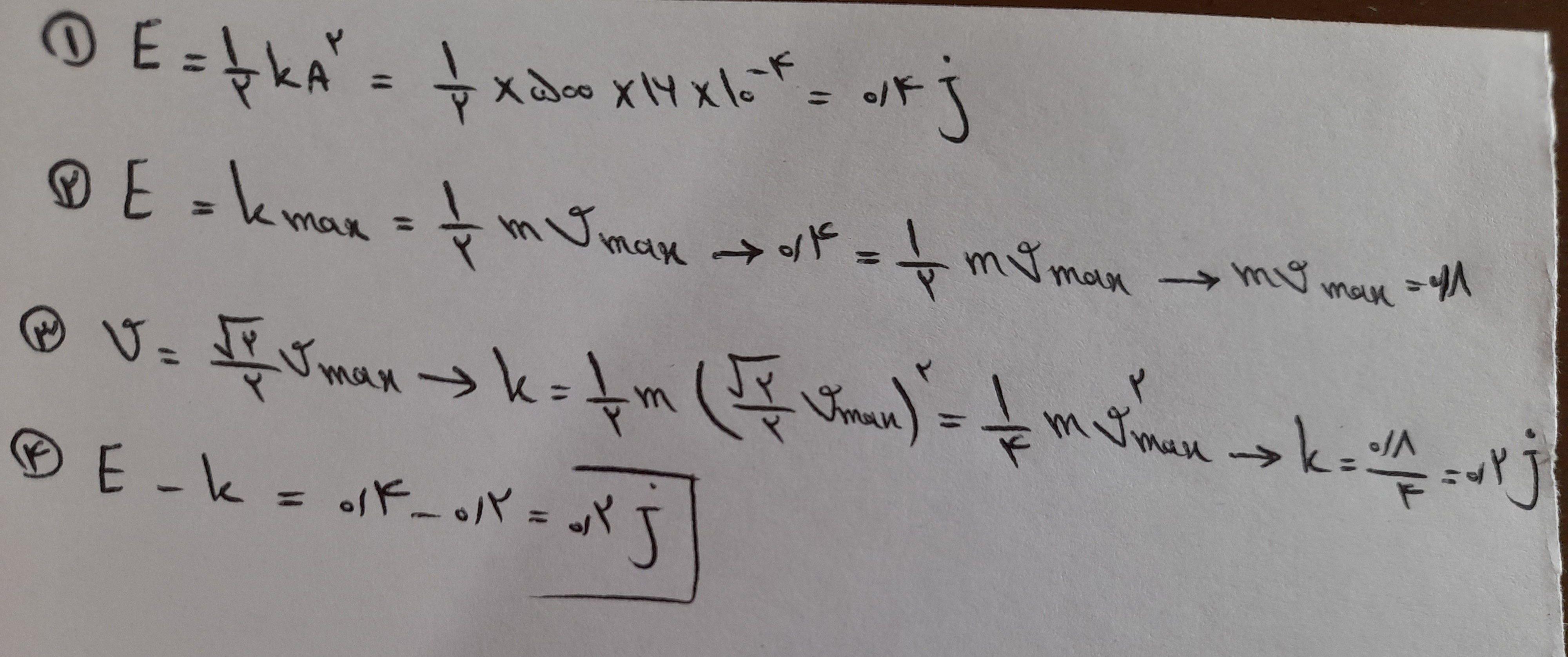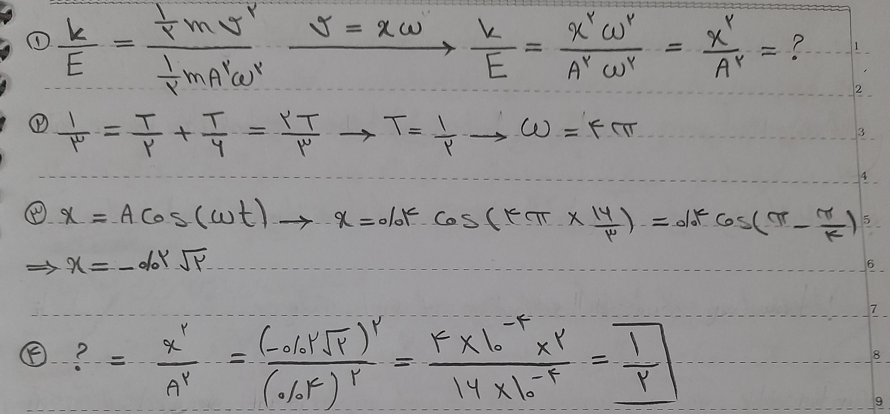 توی این سوال : ما گفتیم جایی که انرژی جنبسی و پتانسیل با هم برابر هست نوسانگر توی بعد Aدوم هست و از اونجایی که فرمول سرعت رو داریم V=XWپس دو و نیم سانتی متر ضرب در ده به توان منفی دو ضرب در دو پی تقسیم بر یک دهم که Tمیکنیم که جواب برابر میشه یک دوم پی . کجای این راه حل غلطه؟