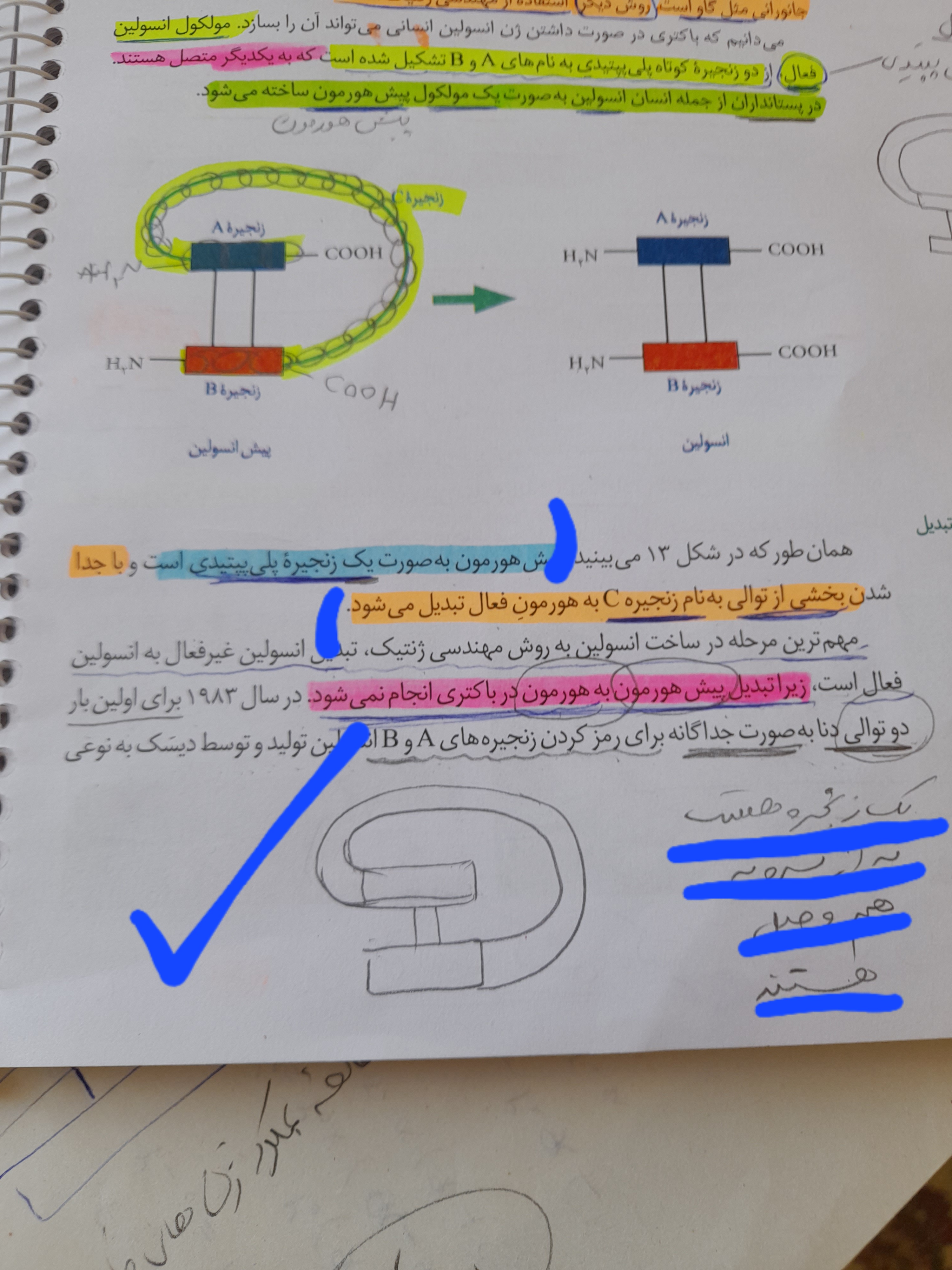 سلام . یه مسئله خیلی مهم این هست که استاد از اول تا آخر میگن که انسولین غیر فعال از سه زنجیره پلی پپتیدی ساخته شده . زنجیره A و B و C در حالی که توی کتاب به صراحت نوشته همشون یک زنجیره هستن که به قسمت از توالی این زنجیره واحد ، زنجیره C گفته میشه که وقتی میخواد فعال بشه از این زنجیره جدا میشه . با اینکه واقعا مدیون استاد هستم اما نمیدونم چرا گاهی انقدر فاحش اشتباه تدریس میکنن .