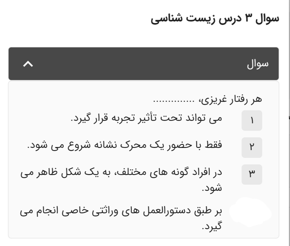 @کیمیا نور محمدی گزینه اول:غلط برخی رفتار های غریزی تحت تاثیر یادگیری قرار نمیگیرند و تغییر نمیکنند گزینه دوم:غلط امکان دارد با حضور چند محرک اتفاق بیفته گزینه سوم:غلط از لحاظ کلیات باهم متشابه ولی از لحاظ جزئیات با هم متفاوتن(برای مثال ممکن است شکل لانه ای که دو گونه مختلف از پرندگان میسازند با هم متفاوت باشه) گزینه چهارم:درست اساس بروز هرگونه رفتار،ژنتیک و وجود ژن هایی است که در بروز و کنترل رفتار مورد نظر نقش دارن