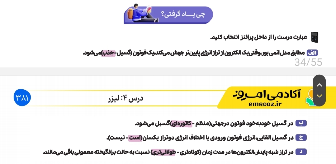 @𝚜𝚒𝚜𝚒 |: سلام . طبق پاسخنامه فکر کنم منظورشون (از انرژی بالاتر به تراز انرژی پایین تر جهش میکند) هست که جواب میشه گسیل . وگرنه طبق مورد الف جواب همون جذب میشه.