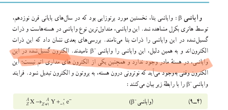 سلام امیدوارم حالتون خوب باشه میشه نکته ای که میگه الکترون های گسیل شده در واپاشی بتا در هسته مادر وجود نداره و همچنین یکی از الکترون های مداری اتم نیست را توضیح بدید که خب این الکترون گسیل شده پس از کجا امده؟