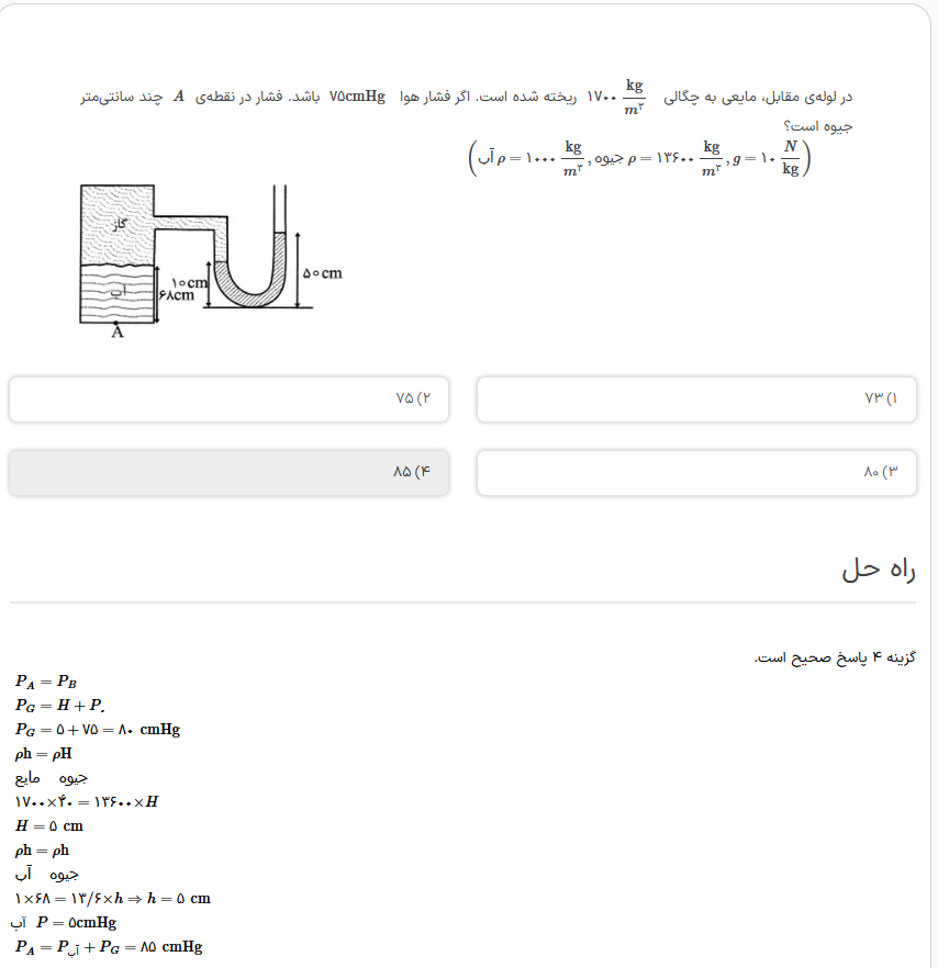 من این قسمتو متوجه نشدم چرا باید فشار هوا از گاز بیشتر باشه وقتی مایع رفته بالا باید گزینه یک میشد