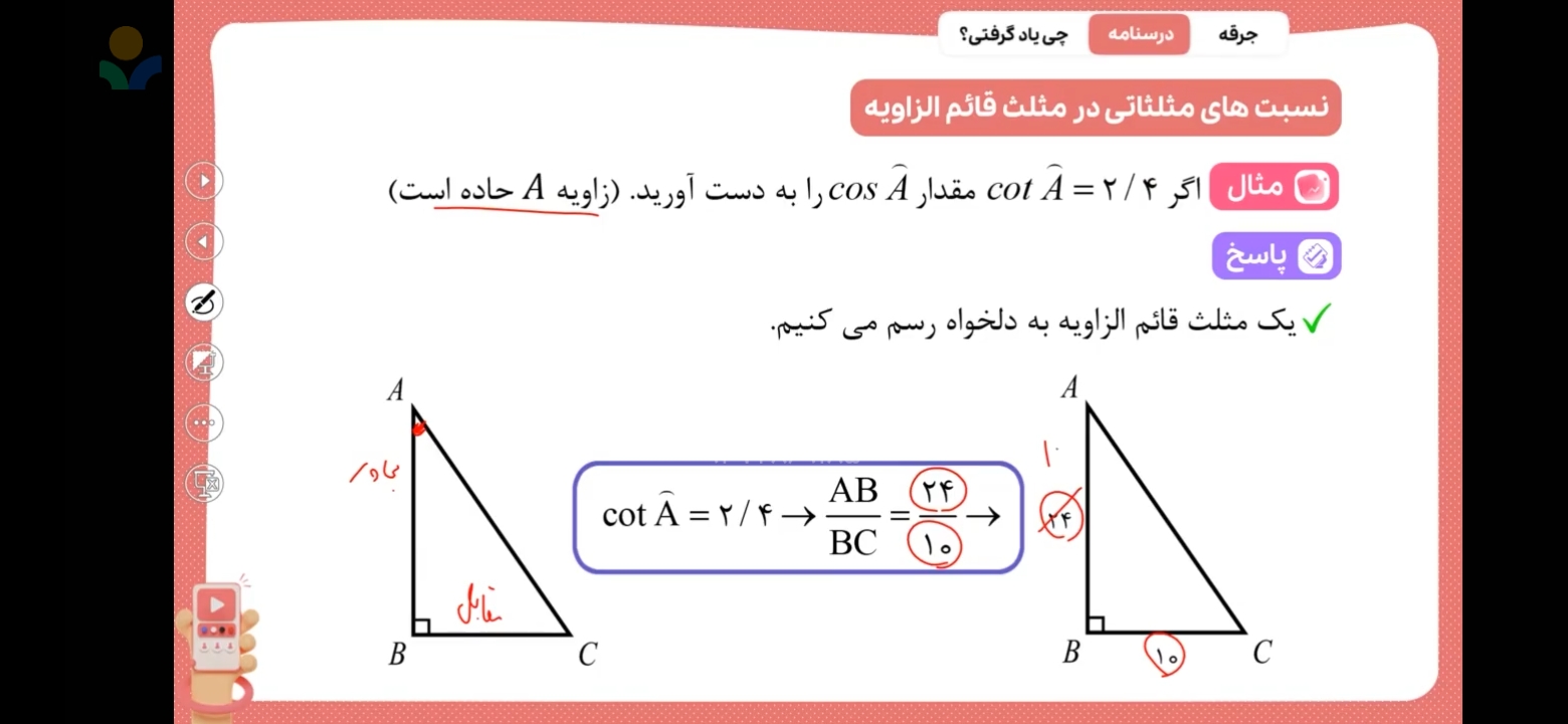 سلام وقتتون بخیر ببخشید یه سوال داشتم چرا ضلع مجاور در مثلث قائم الزاویه در این مثلث شده سمت چپه مثلث مگه نباید ضلع مجاور قسمت پایین مثلث و ضلع مقابل سمت چپه مثلث