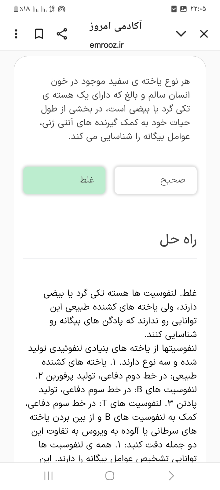 @عطیه رحمانی سلام وقت بخیر این سوال همینطور ک متوجه شدید منظورش لنفوسیت ها هستش ولی اول جمله از (هر) استفاده کرده یعنی باید کشنده طبیعی رو هم در نظر بگیریم که بر خلاف اون یکی لنفوسیت ها توانایی شناسایی دقیق میکروب رو نداره پس گیرنده آنتی ژنی هم نداره.