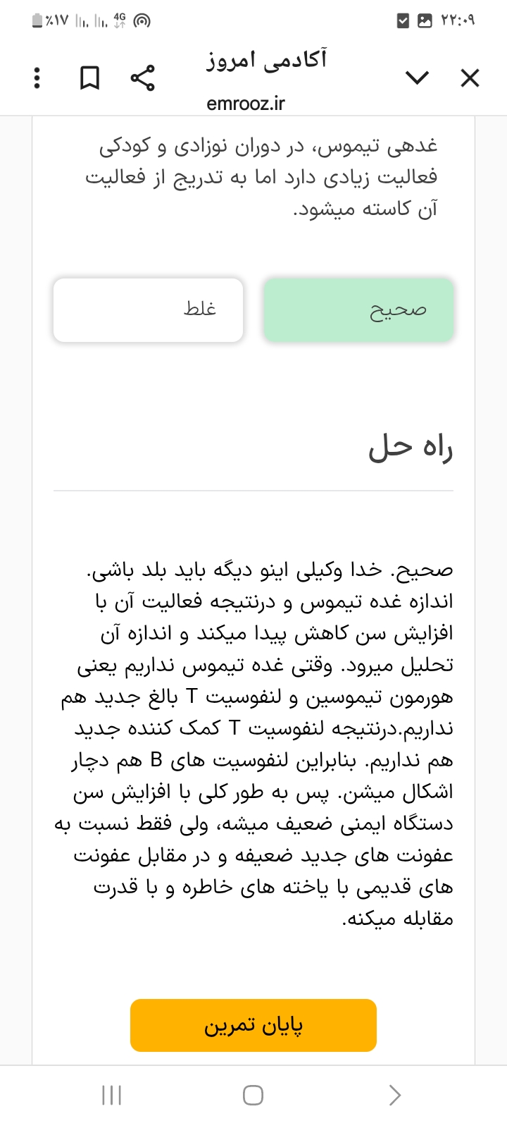 سلام وقت به خیر اگر ممکن هست پیام بنده رو پاسخ بدید در قسمت تمرین های این بخش یک جا نوشته شده در بزرگسالی غده تیموس ازبین میرود ولی در تدریس فکرکنم استاد فرمودند ازبین نمیرود کوچک میشود ونوشته شده بود چون تیموس ازبین میرود بالغ شدن یاخته های لنفوسیت Tرا نخواهیم داشت ولنفوسیت های Bاسیب میبینه ممکن هست توضیح بدید این قسمت با درسنامه که دیدم فرق داره چون استاد فرمودند تیموس کوچک وکم کار میشه