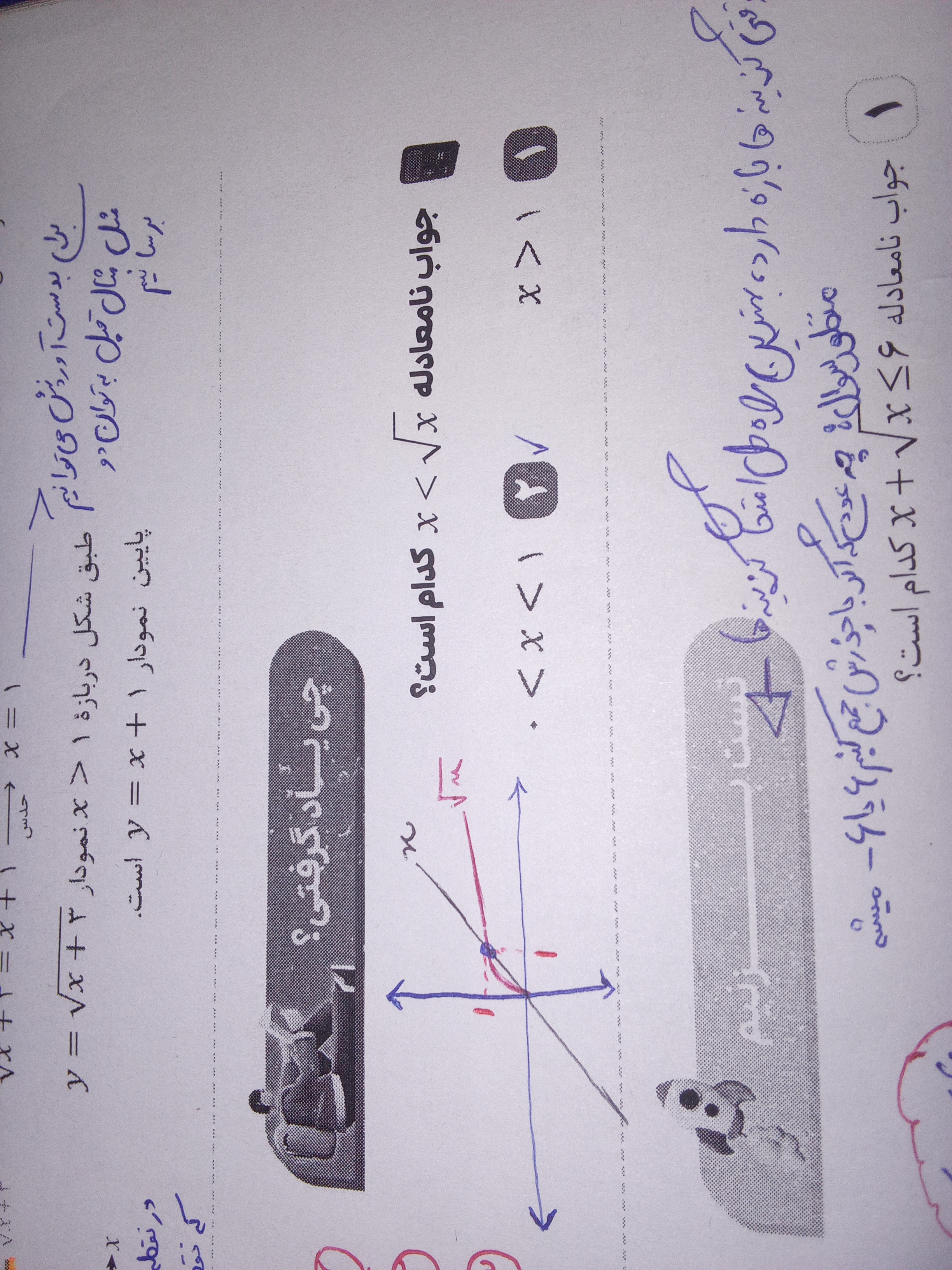 تیکه ی اخر پیام منظورم اینه که x بازه های گزینه ی 3 و4 رو امتحان کردم ولی دو طرف تساوی برابر نمیشد و به همین خاطر نتونستم نقطه ی برخورد رو پیدا کنم.