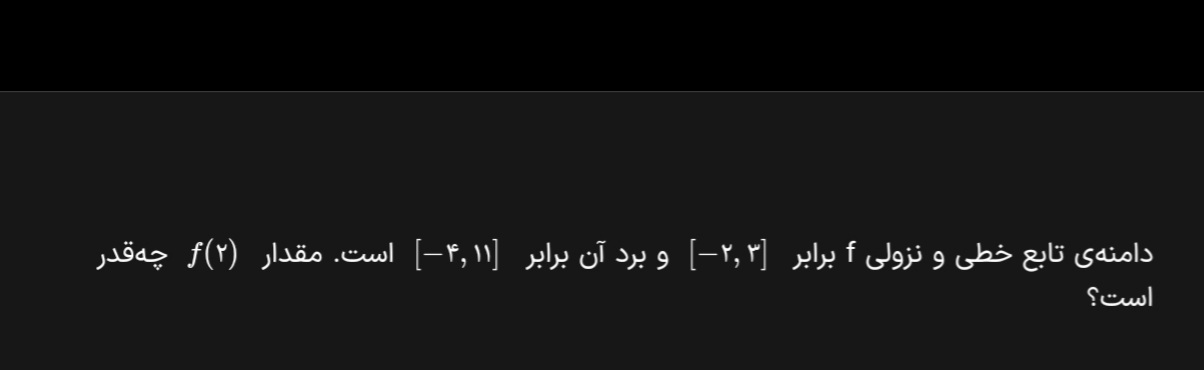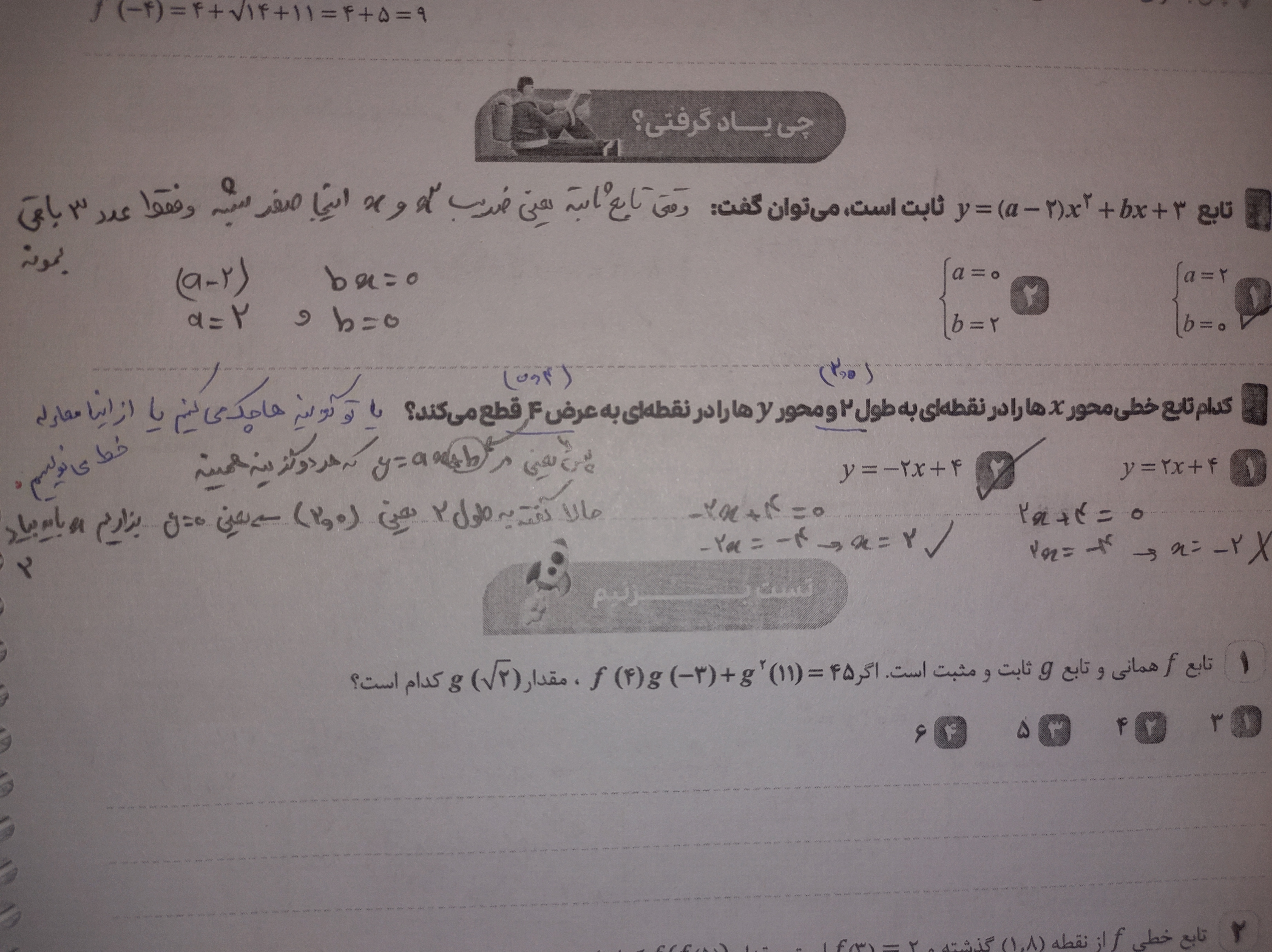 سلام نمیشه گفت که عدد اول دامنه با عدد اول برد و عدد دوم دامنه با عدد دوم برد دئ تا نقطه رو به وجود می آورند که اگر با این دو تا نقطه ضابطه را بنویسیم همین ضابطه میشه و از روی اون جواب ها رو پیدا کنیم دو تا نقطه (2و0) و (1و2) حالا ضابطه رو مینویسیم b=-2 و F(x)= ax+b F(x)= ax-2 1=2a-2 a=3/2 F(x)= 3/2x-2 F(2/3)= 3/2(2/3)-2= -1