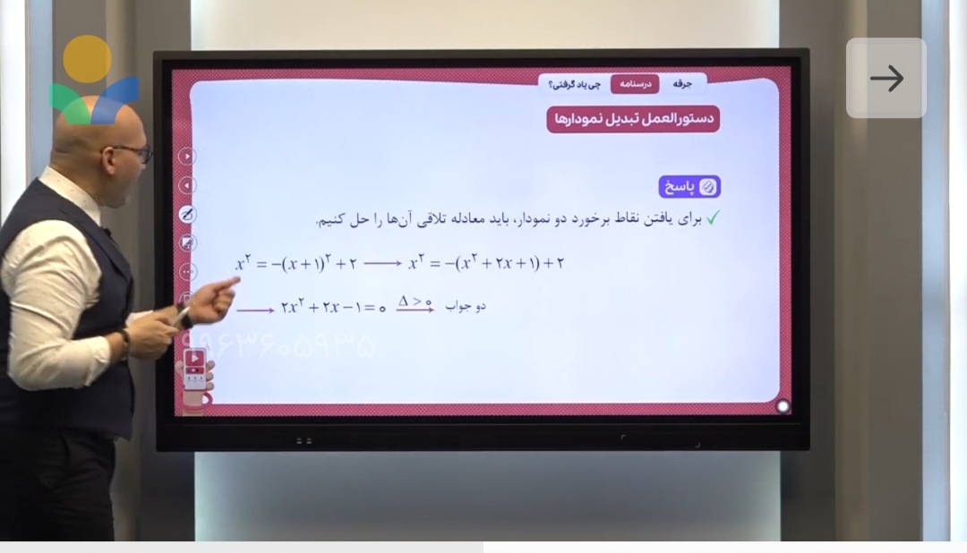 سلام ببین وقتی در کل میخوای ببینی دو تا نمودار در چند نقطه و چه نقاطی همدیگه رو قطع میکنن،کافیه معادلشون رو با هم برابر بذاری و حلش کنی و عددی که به عنوان جواب این معادله برای ایکس بدست میاری،یعنی در اون نقطه،همدیگه رو قطع میکنن 🌷 (البته به شرطی که اون نقطه در دامنه هر دو نمودار باشه)