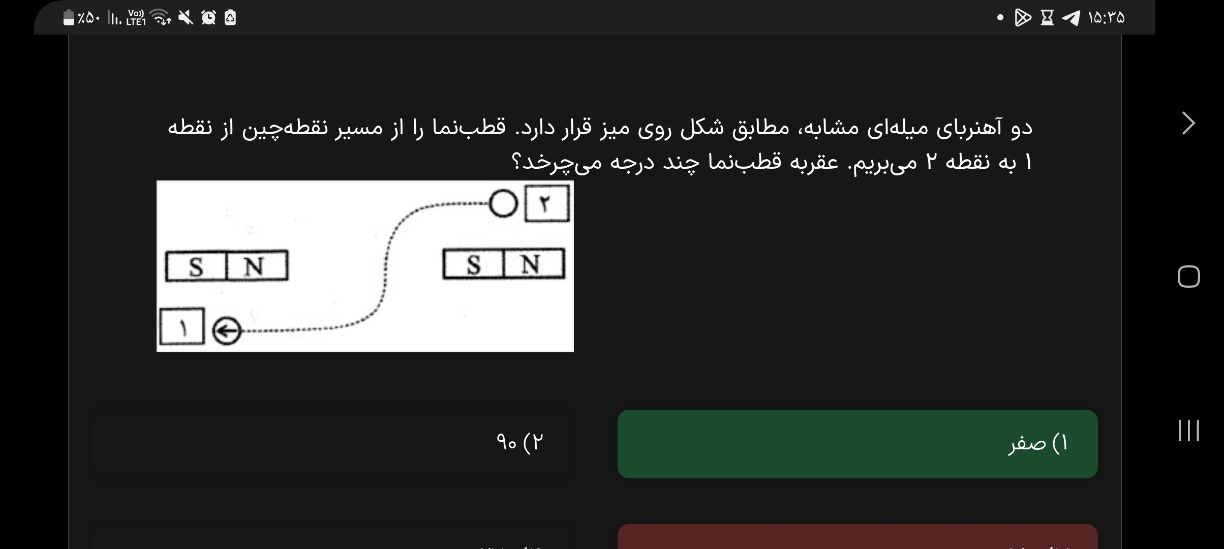 چی یادگرفتی جوابش میشه گزینه 3چون که گفته همواره و خب ما تنها در فضا میگیم میدان مغناطیسی از قطب Nخارج و به Sرفته درصورت که در داخل آهن با از Sبه Nمیرود