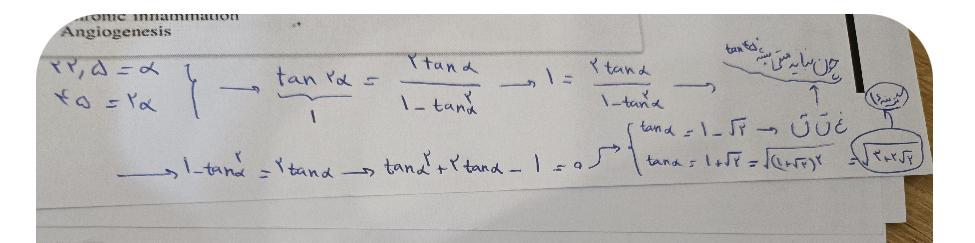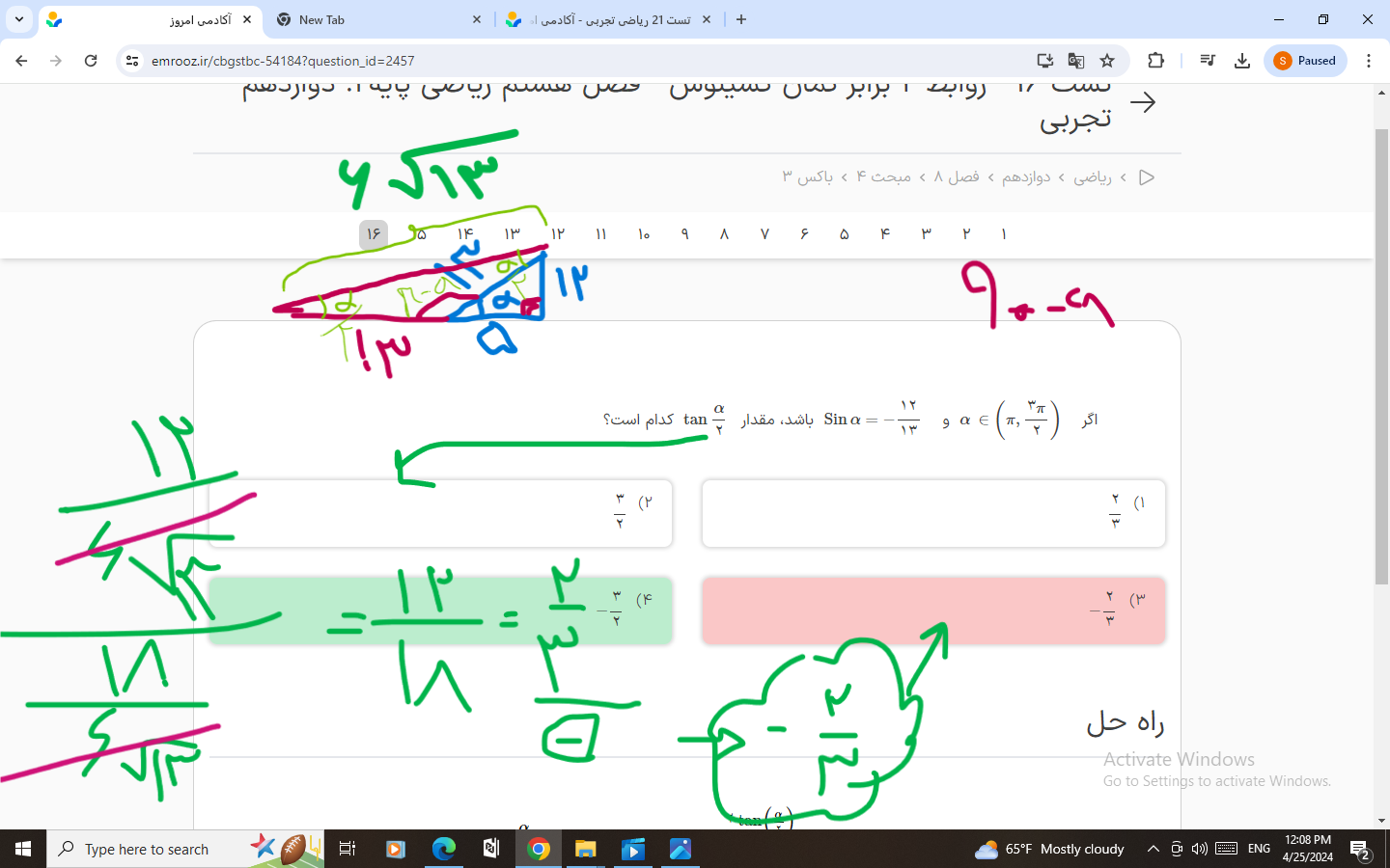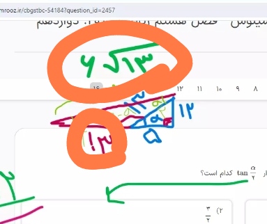 @. . اشکال این روش،در محدوده آلفا هست یعنی طبق این شکلی که شما کشیدید،آلفا کوچکتر از پی دوم فرض شده در حالیکه طبق داده سوال،آلفا بین پی تا پی دوم هست و در نتیجه آلفا دوم بین 90 تا 135 درجه باید باشه و همین باعث شده که با شکل کشیدن به اشتباه بیفتید اگر هم با معادله حل کنید این رو،آخرش دوتا جواب برای تانژانت آلفا دوم بدست میاد که یکیش منفی دو سوم و یکیش هم منفی سه دوم هست و منفی دو سوم بدلیل محدوده کمان آلفا،غیر قابل قبول هست،چرا که اگر محدوده آلفا دوم رو روی دایره مثلثاتی بررسی کنیم،مقدارش در بازه از منفی بینهایت تا منفی یک هست این رو توی پاسخنامه این سوال هم نوشته